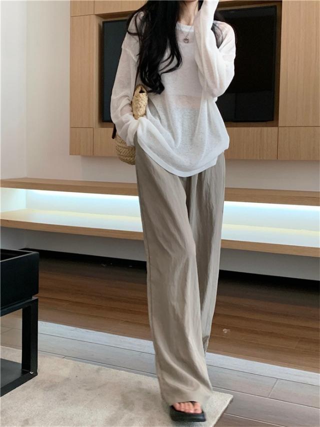 シアートップス レディース 夏 薄手 インナー シアー トップス 微透け 透け感 ゆったり カジュアル クールネック 長袖 シースルー 大人 日焼け対策 uv対策 体型カバー シャツ ブラウス ホワイト 白