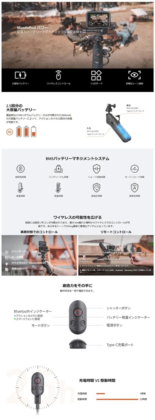 5000mAhのバッテリーを内蔵しているため、取り付けたアクションカメラに瞬時に給電することができ、長時間の使用が可能です。