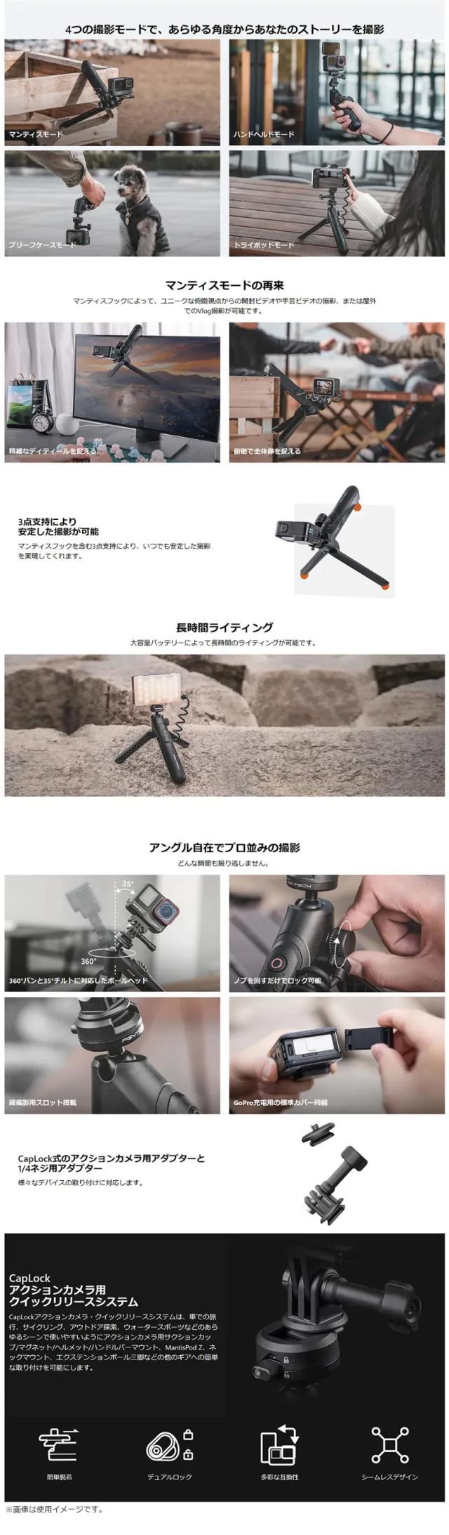 付属のCapLock式のアクションカメラ用アダプターと1/4ネジ用アダプターを活用することで、従来のカメラマウントの煩わしさを解消してくれます。また、アクションカメラだけでなくスマートフォンにも対応しているため、ダイナミックなコンテンツ制作にピッタリのアイテムです。