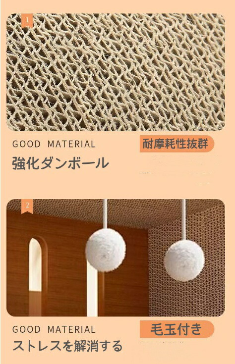 - 猫がどこからでも入れるのが楽しいようです。耐久性も高く、爪を研いでも壊れにくい。毛玉付きで遊びながらくつろげるので、ストレス解消にもなっています。