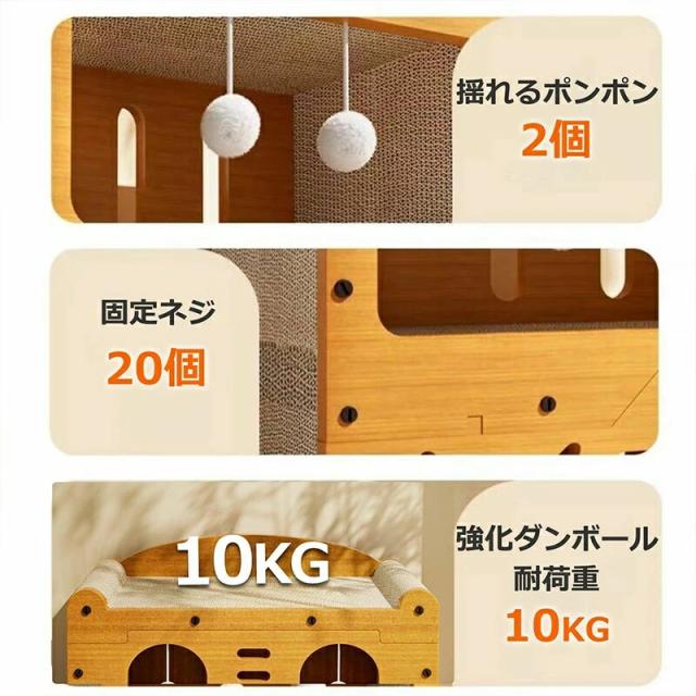 【八面爪とぎ、広いスペース】猫ちゃんはあらゆる面を使って爪とぎが可能です。穴の中も安心して寝たり遊んだりして楽しんでくれてます。10kgまでの猫をサポートでき、太った猫や大きな猫も隠れることができ、猫の隠れる性質を満足させます。 それに上下2階で2匹の猫が同時に遊べます。