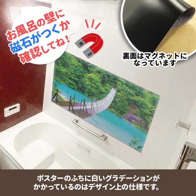 お風呂で使えるマグネット製のポスターです。 ■商品サイズ:約1100×570mm ※本製品はマグネットを使用しています。タイルや木製等、磁石がつかない壁面にはご使用いただけませんので、ご使用になる場所に磁石がつくことをご購入前にご確認ください。 |