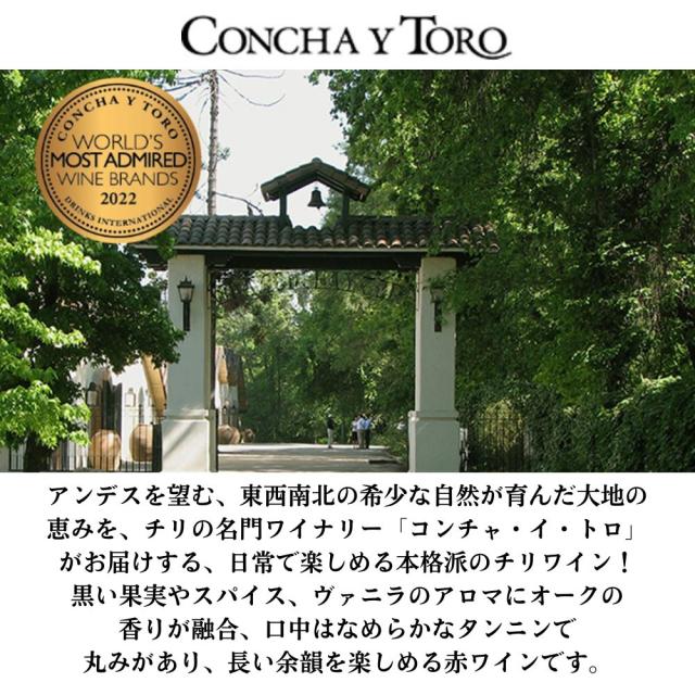 アンデスを望む、東西南北の希少な自然が育んだ大地の恵みを、チリの名門ワイナリー「コンチャ・イ・トロ」がお届けする、日常で楽しめる本格派のチリワイン!黒い果実やスパイス、ヴァニラのアロマにオークの香りが融合、口中はなめらかなタンニンで丸みがあり、長い余韻を楽しめる赤ワインです。