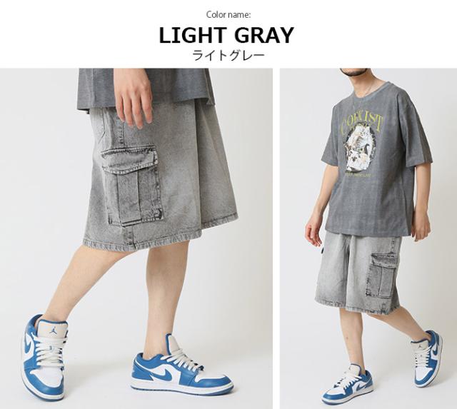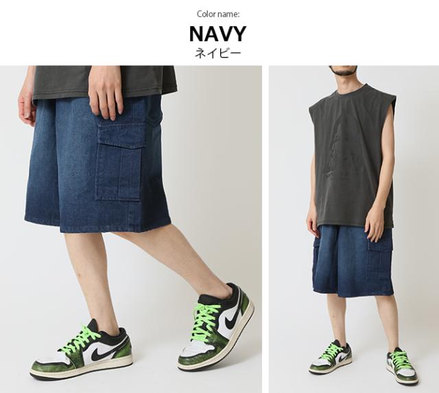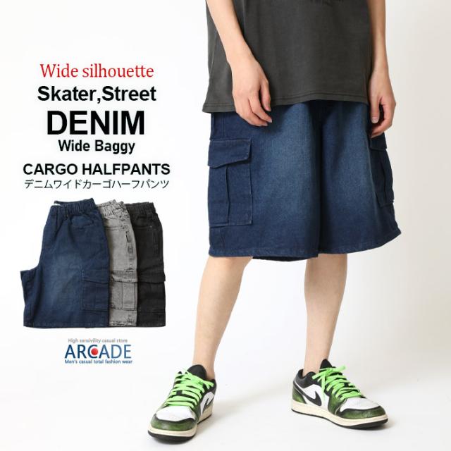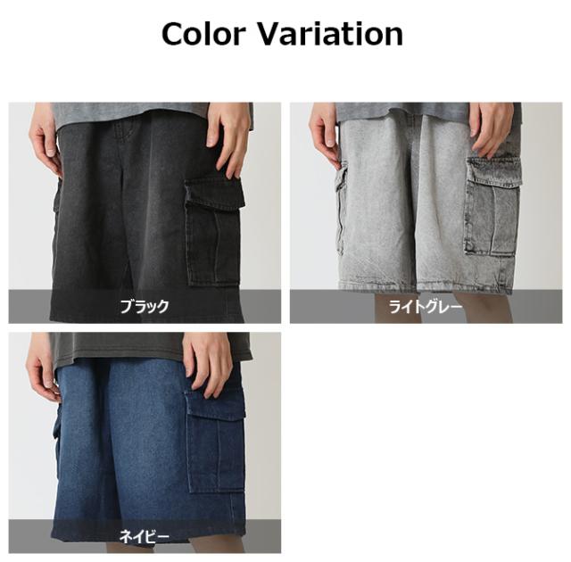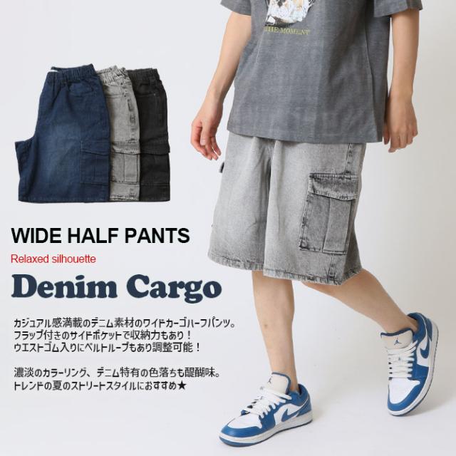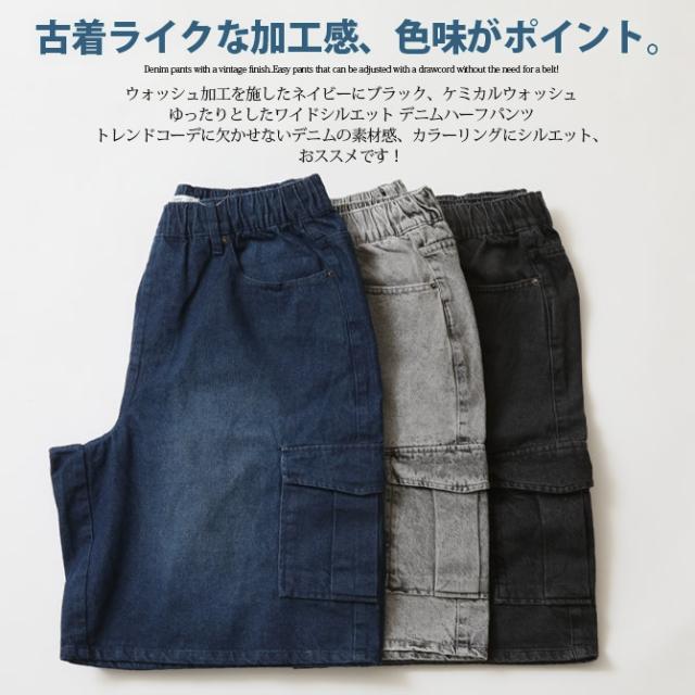 ハーフパンツ メンズ デニムワイドカーゴハーフパンツ ウエストゴム サイドポケット デニム ショーツ