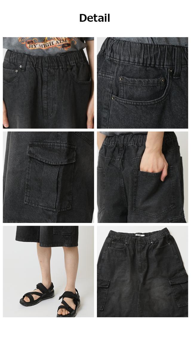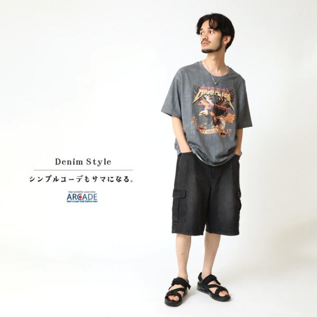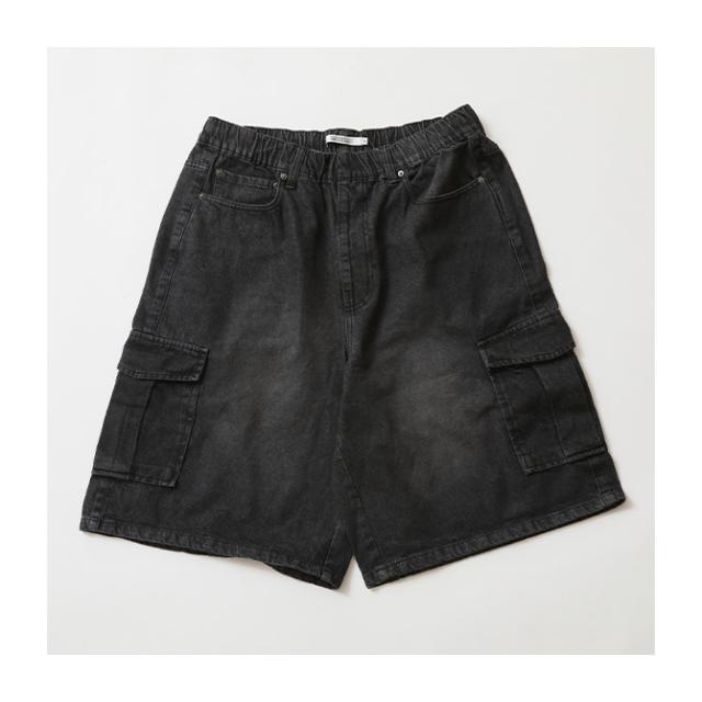 カジュアル感満載のデニム素材のワイドカーゴハーフパンツ。