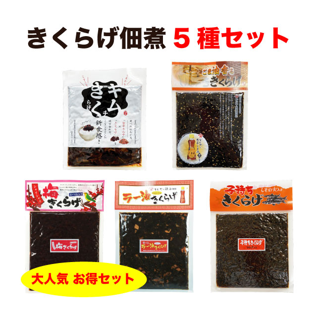きくらげ 佃煮 5袋セット ラー油きくらげ 子持ちきくらげ(ししゃもきくらげ) 梅きくらげ ごま油きくらげ キムチきくらげ ご飯のお供 送料無料