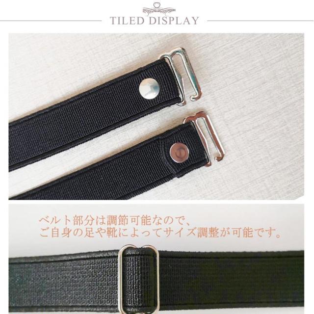 | 脱げ防止のシューズバンド。長さ調節可能 カカトのパカパカ脱げにもバッチリ! 靴に元からついていたかのような一体感があり、つけ心地◎ ベルト部分は調節可能なので、ご自身の足や靴によってサイズ調整が可能です。 雰囲気異なる豊かなカラバリが用意され、お好きな色幾本揃って買うのもオススメ | |