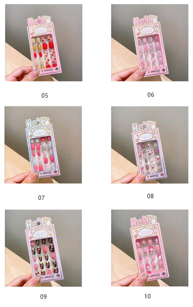 | 【商品名】子供用ネイルチップ 【セット内容】24枚入り 【素材】プラスチック 【特徴】子供と一緒に楽しいネイル遊びをしてください。 特別な日のネイルに最適のネイルチップ。自爪につけるだけで指先のオシャレが簡単に! 子供の爪のサイズを研究して作られたチップが24枚入り。 使い方法: 1.爪表面の油脂を除去します。 2.爪のサイズに合わせてシールを選びます。 3.シールを爪の根本から爪の先に向けて全体に貼り付けます。 4.爪の余分なシールを爪やすりで整えます。 | |