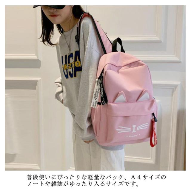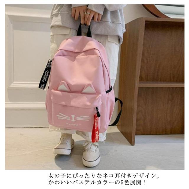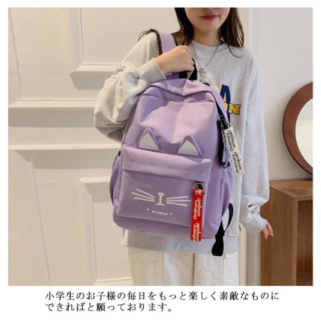 | 猫派にはたまらない!ネコ耳付きリュック。 ネコ耳がついた可愛いリュックサック、ヒゲのイラストもかわいさのポイント! 女の子にぴったりなネコ耳付きデザイン。かわいいパステルカラーの5色展開! 普段使いにぴったりな軽量なバック、A4サイズのノートや雑誌がゆったり入るサイズです。 小学生のお子様の毎日をもっと楽しく素敵なものにできればと願っております。 | |