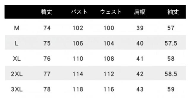 | サイズについての説明 | M L XL 2XL 3XL サイズ:写真通り ※上記サイズは平置き実寸になります。サイズ表の実寸法は商品によって1-3cm程度の誤差がある場合がございます。 |