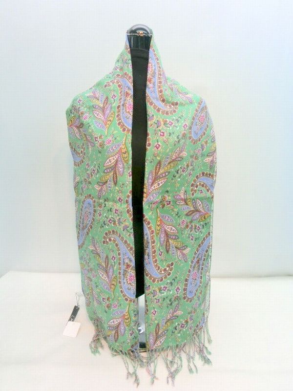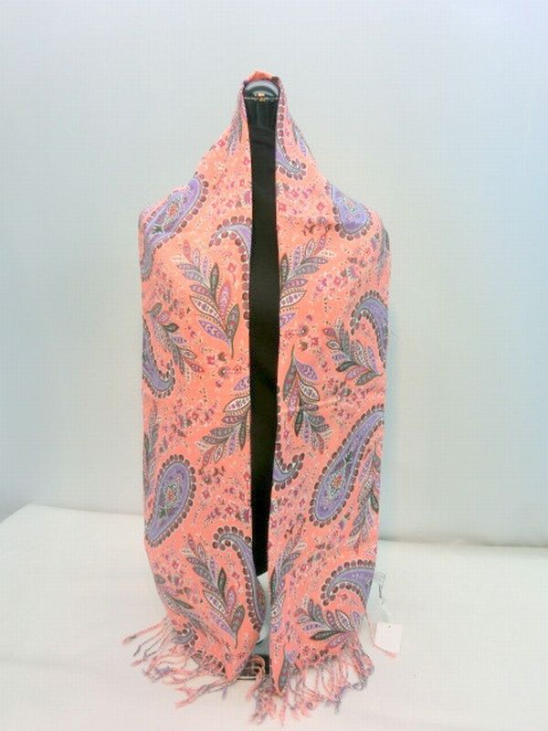 | 鮮やかな配色のコットン生地使用のペイズリープリントストールです。 春夏のオシャレのポイントやUVケアに肌に優しい綿100%のストールをお使い下さい。 |