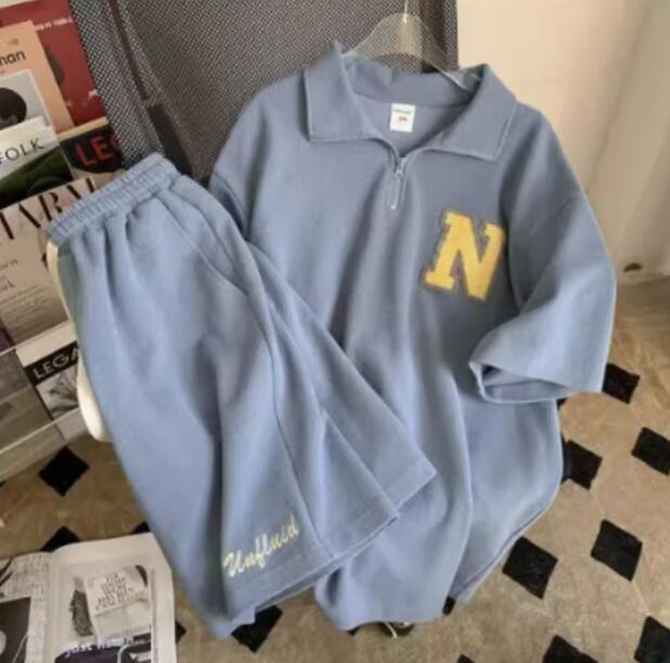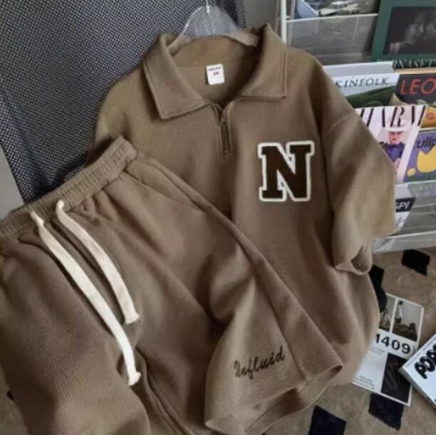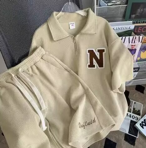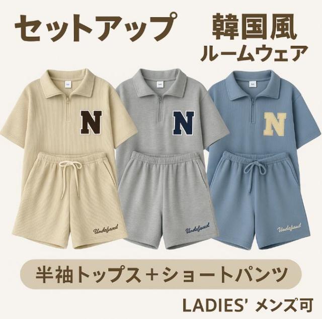 【セットアップ】春秋ルームウェア 上下セット レディース メンズ可 韓国風 スウェット Nロゴ ワッフル素材 半袖トップス+ショートパンツ おしゃれ部屋着