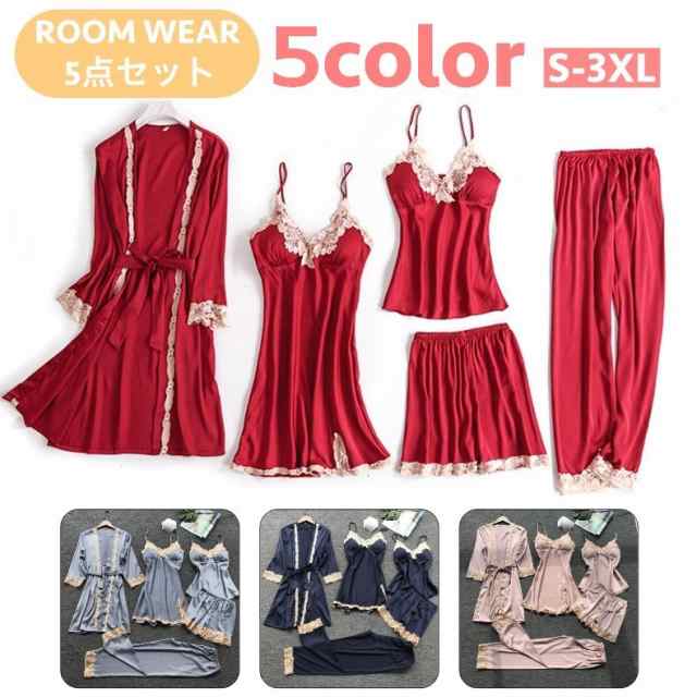 ルームウェア 5点セット レディース キャミソール スリップ ガウン ロングパンツ 長ズボン ショートパンツ サテン調 大きいサ