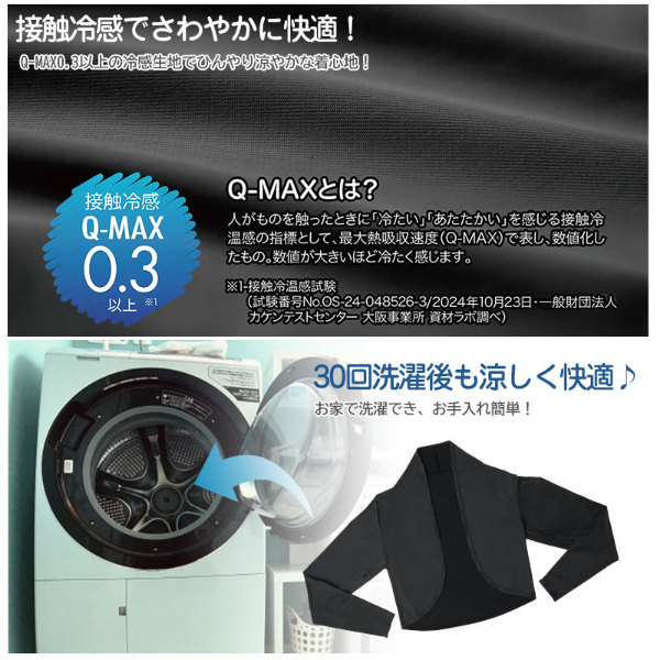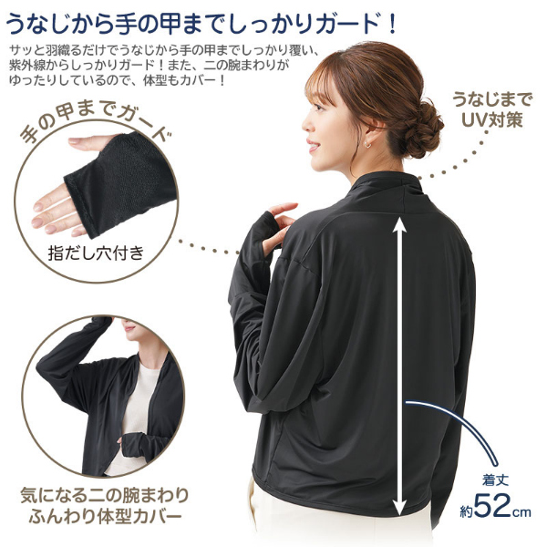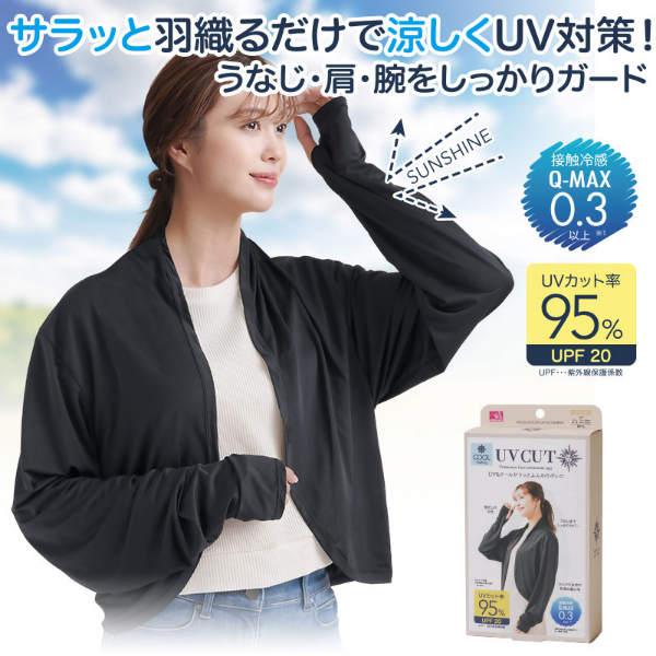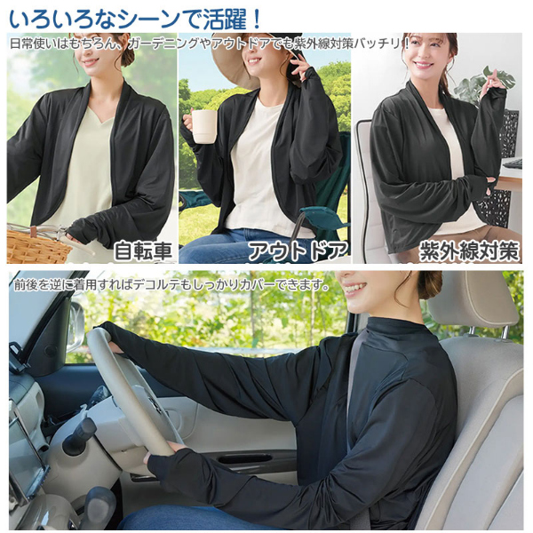 サッと羽織るだけでUV対策!うなじ・肩・腕・手の甲をしっかりガードするボレロ。●UVカット率95%&UPF20で紫外線対策◎高いUVカット効果でしっかり紫外線対策できます。●うなじから手の甲までしっかりガード!サッと羽織るだけでうなじから手の甲までしっかり覆い、紫外線からしっかりガード!また、二の腕まわりがゆったりしているので、体型もカバー!●接触冷感でさわやかに快適!Q-MAX0.3以上の冷感生地でひんやり涼やかな着心地!●いろいろなシーンで活躍!日常使いはもちろん、ガーデニングやアウトドアでも紫外線対策バッチリ!前後を逆に着用すればデコルテもしっかりカバーできます。●30回洗濯後も涼しく快適♪お家で洗濯でき、お手入れ簡単!