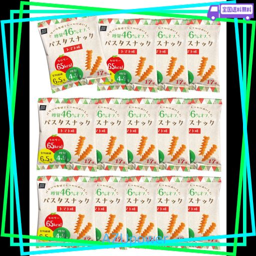 パリパリ食感でしっかりおいしい 糖質46%オフ(※) パスタスナック。1袋(17G) 食べても糖質4.9G、カロリー65KCAL、食物繊維は6.5G (※)当社の一般的なパスタスナック(トマト味)と比べ、糖質を46%低減しています。