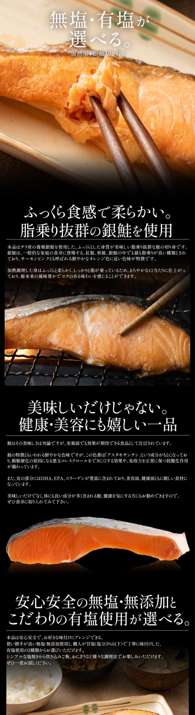 養殖銀鮭(チリ産)、食塩/酸化防止剤(ビタミンC,チャ抽出物)、pH調整剤