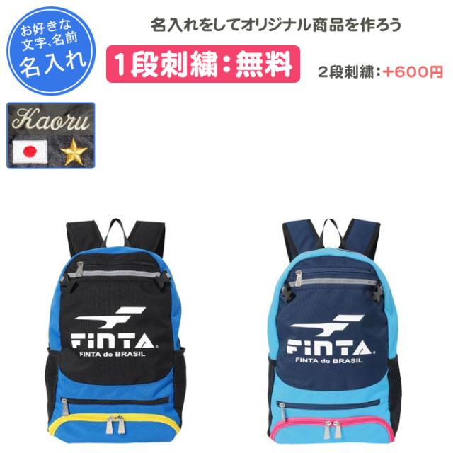 FINTAのリュックに刺繍加工をしてオリジナル商品をつくちゃおー♪ チーム名、名前、好きな言葉などネームを入れることができます!! 卒団、プレゼント記念品としておすすめです!! 1段刺繍代:無料 2段刺繍代:+600円(税込) ロゴ刺繍代:+300円(税込)となっております。 (ロゴ刺繍は、文字の糸と同色になり、刺繍文字の後ろに入ります。なお、日本国旗のみ写真のように赤と白の刺繍となりますのでご注意ください。) ※1段の文字数は8文字までとなります。 サッカー、フットサル向け子供用のリュックサック。 サッカーやバスケットボールのほか、子供達のスポーツシーンを想定して多くの機能を満載のリュックです。 シューズ、ボトル、小物など目的に合わせた豊富な専用ポケット群。 コンパクトに収納できるボール用のネット。 突然の雨にも対応する撥水加工素材。 夜間の安全に配慮したリフレクター(再帰反射)などを装備した絶対オススメのアイテムです。 機能 ボール用ネット・ネット収納ポケット、シューズ収納ポケット、ランドリーポケット、コイン・キーポケット、 ボトルポケット、メッシュポケット(シンガード収納可)、撥水加工、リフレター(再帰反射)、ネームタグ(移動中などは外から見えないバッグ背面) カラー:0521/ブラック×ブルー、1122/ネイビー×サックス サイズ:H40cm×W34cm、容量16L 素材:ポリエステル100%(撥水加工) ※シューズ・ボールの付属はございません。