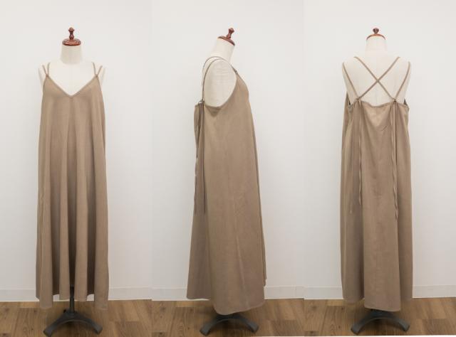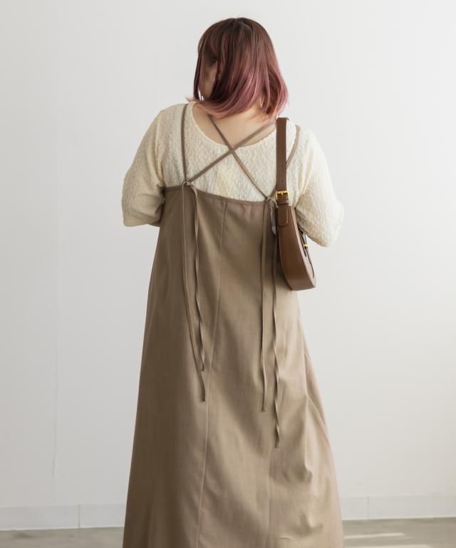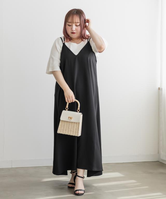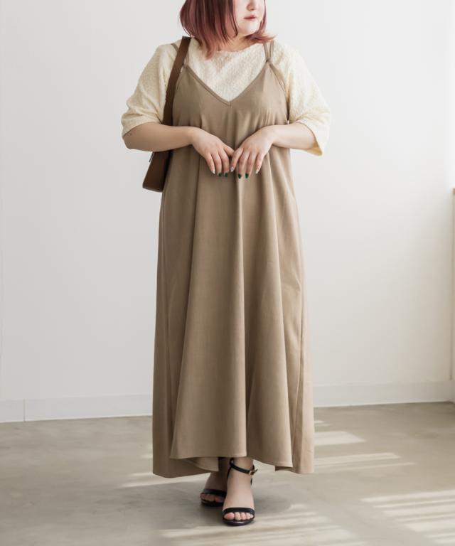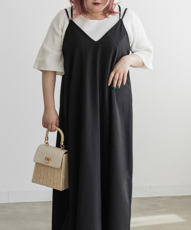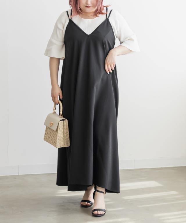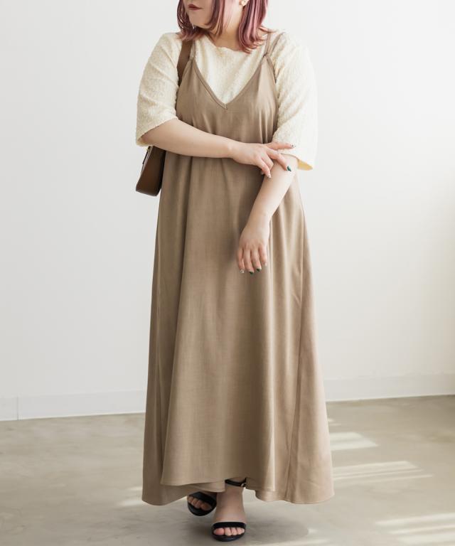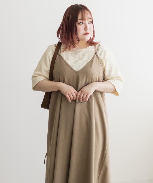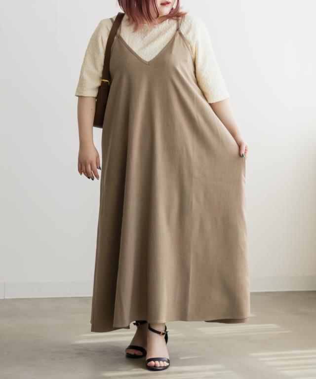 | 3Lサイズを着用して、全体的にゆとりのあるサイズ感でした◎身幅にも程よくゆとりがあって、インナーを合わせてももたつきにくく、すっきり着られます。ゴムが入っていない仕様なので、サイズ確認もおすすめします!肩のダブルストラップが華奢見えを叶えてくれて、さりげなく女性らしさをプラスしてくれるのがポイント♪程よく落ち感のある素材で広がりすぎず、大人っぽくも着られるキャミワンピだと思います! |