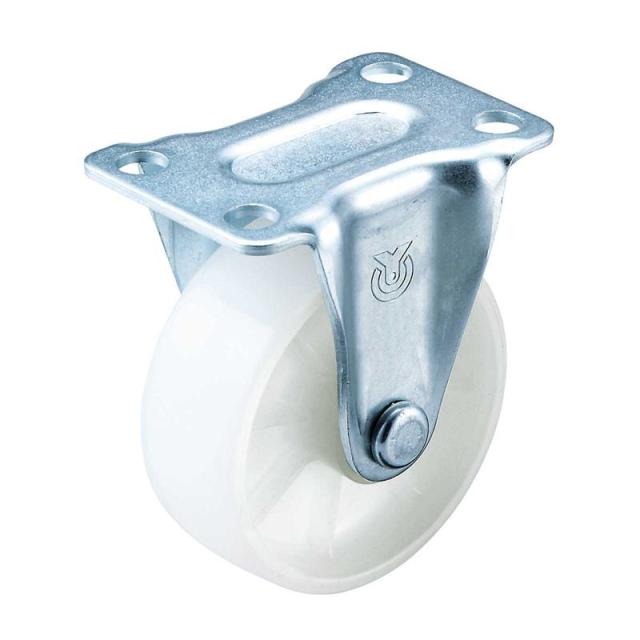 軽荷重用として主に運搬台車や、店舗什器、家具、複写機等その他一般産業用に数多く使用されています。軽荷重用の汎用キャスターです。ナイロン素材で長時間荷重がかかっても変形しづらいです。