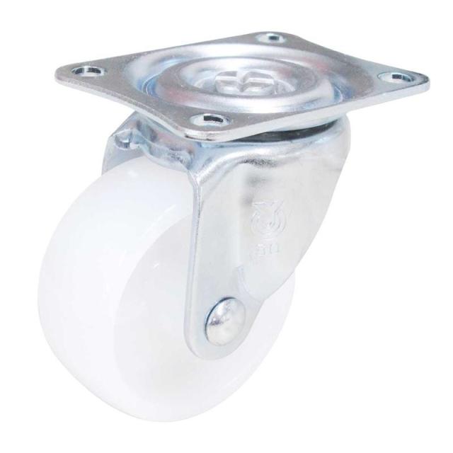 軽荷重用として主に運搬台車や、店舗什器、家具、複写機等その他一般産業用に数多く使用されています。軽荷重用の汎用キャスターです。ナイロン素材で長時間荷重がかかっても変形しづらいです。