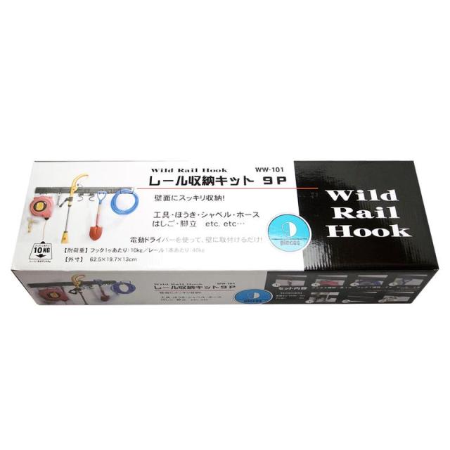 フック耐荷重(kg):10 レール1本耐荷重(kg):40 セット内容:フック5種類(各1個) フック1種類(2個) レール610mm(2本)