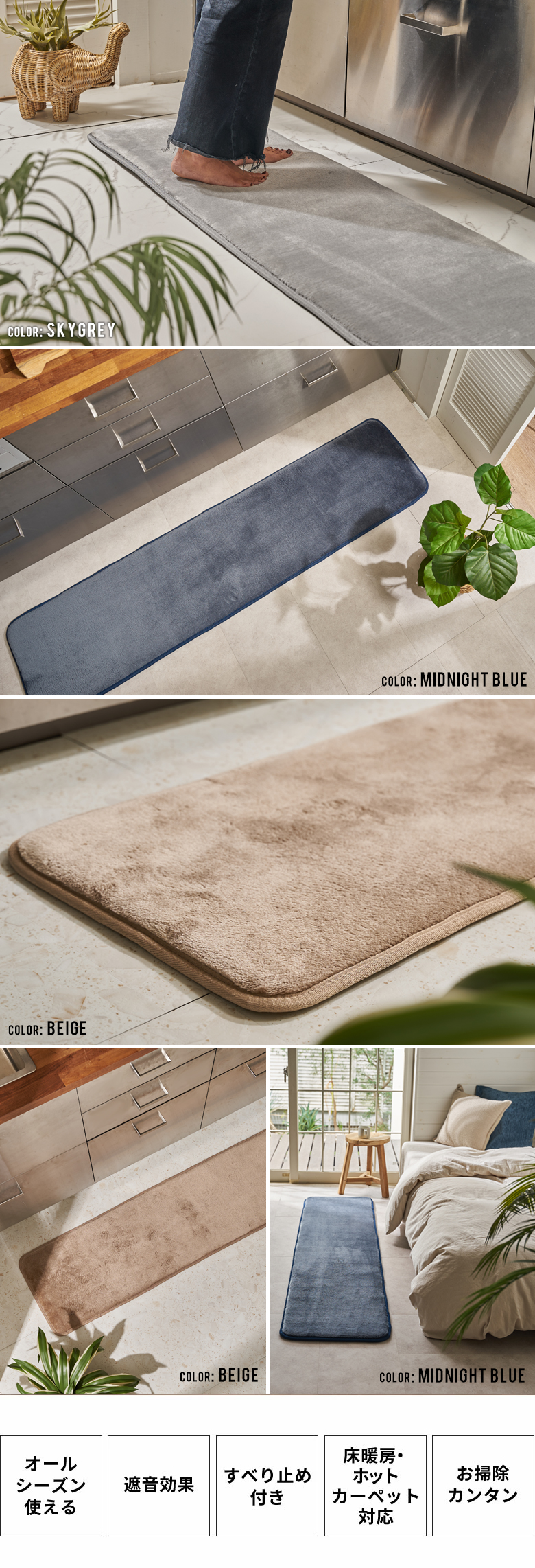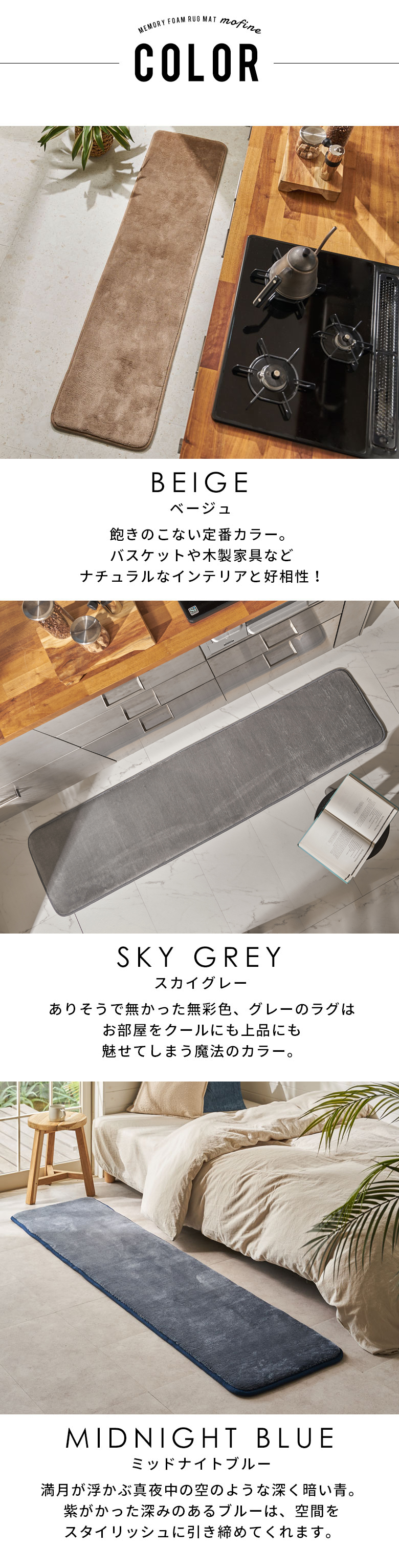 細長いサイズはキッチンマットとしてはもちろん、ワークスペースの足元やソファ前に敷いたり、ごろ寝マットとして活用するなど、使い道は色々。キッチンマットには、このシリーズのカラーバリエーションの中から、ベージュ、スカイグレー、ミッドナイトブルーの人気3カラーをセレクト。落ち着いたカラー展開は、インテリアをおしゃれに引き立てます。