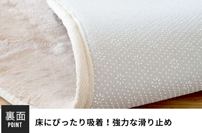 裏面はノンスリップ加工を施した高密度の滑り止めで、お子様やペットがいるご家庭にも安心。28mmの厚みと高いクッション性が生活音を軽減し、騒音対策としてもおすすめ。ホットカーペットや床暖房にも対応しています。