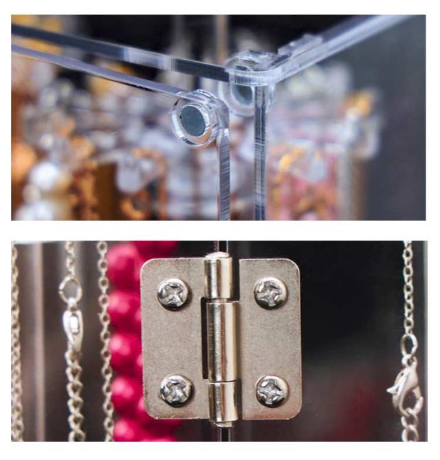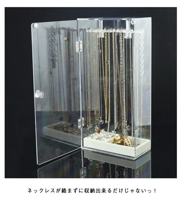 | 【回転式アクセサリースタンド】【透明・大容量・扉式】 ネックレスが絡まずに収納出来るだけじゃないっ! お気に入りのジュエリーを、飾って、見せて、便利に収納! 扉式なのでネックレスの出し入れも楽々!扉の取っ手を軽く引くだけで開きます。 フックは回転するので、奥に吊るしたものも取り出しやすくなってます!! (底部)収納ケースもついているので、ネックレス以外にもリングやブレスレットなどの小物もまとめて収納できるのが嬉しいですね♪ 素材は無色・高透明度のアクリル製なので、アクセサリーを見せながら収納できインテリアとして最適です。 透明度が高く、シンプルなデザインなのでネックレスを入れて飾っておくだけでお部屋のインテリアにも! 24本のフック付き!最大72本ネックレスがかけられます。 | |