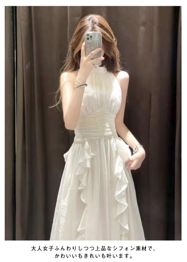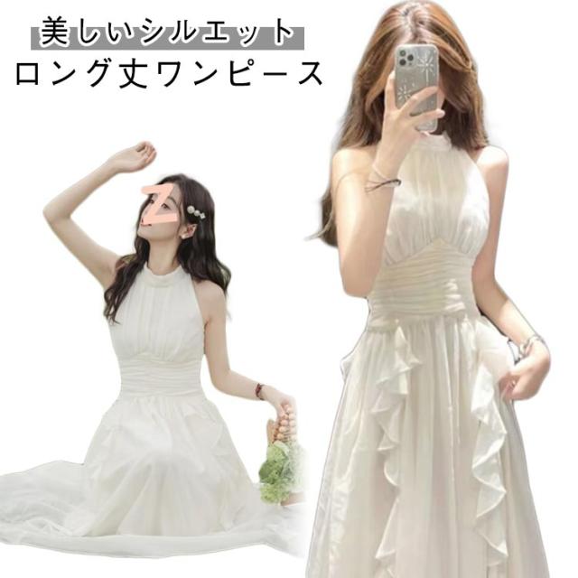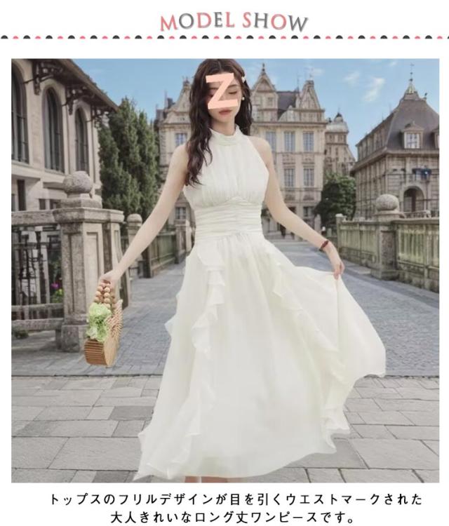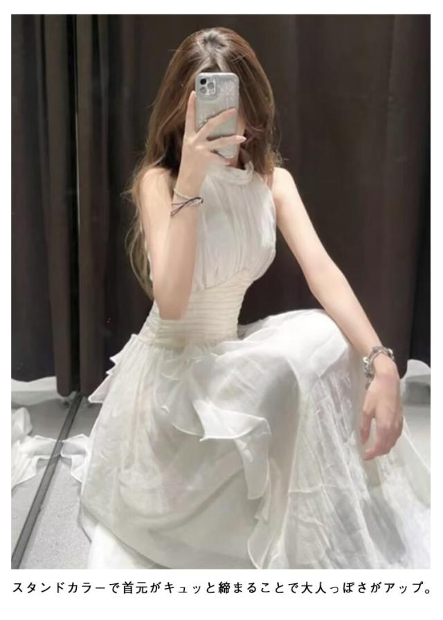 ノースリーブ ロング丈 レーディスワンピース ロングワンピース 裏地付き ワンピース フリル ハイウエスト ワンピース ウエストマーク オフィスカジュアル きれいめ フェミニン