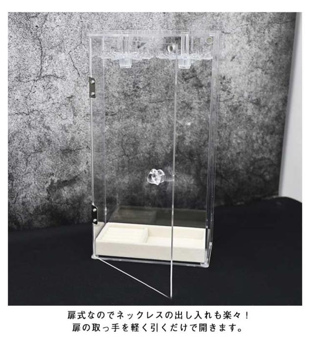 | 【回転式アクセサリースタンド】【透明・大容量・扉式】 ネックレスが絡まずに収納出来るだけじゃないっ! お気に入りのジュエリーを、飾って、見せて、便利に収納! 扉式なのでネックレスの出し入れも楽々!扉の取っ手を軽く引くだけで開きます。 フックは回転するので、奥に吊るしたものも取り出しやすくなってます!! (底部)収納ケースもついているので、ネックレス以外にもリングやブレスレットなどの小物もまとめて収納できるのが嬉しいですね♪ 素材は無色・高透明度のアクリル製なので、アクセサリーを見せながら収納できインテリアとして最適です。 透明度が高く、シンプルなデザインなのでネックレスを入れて飾っておくだけでお部屋のインテリアにも! 24本のフック付き!最大72本ネックレスがかけられます。 | |