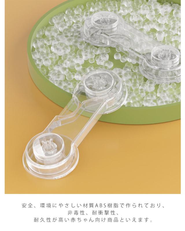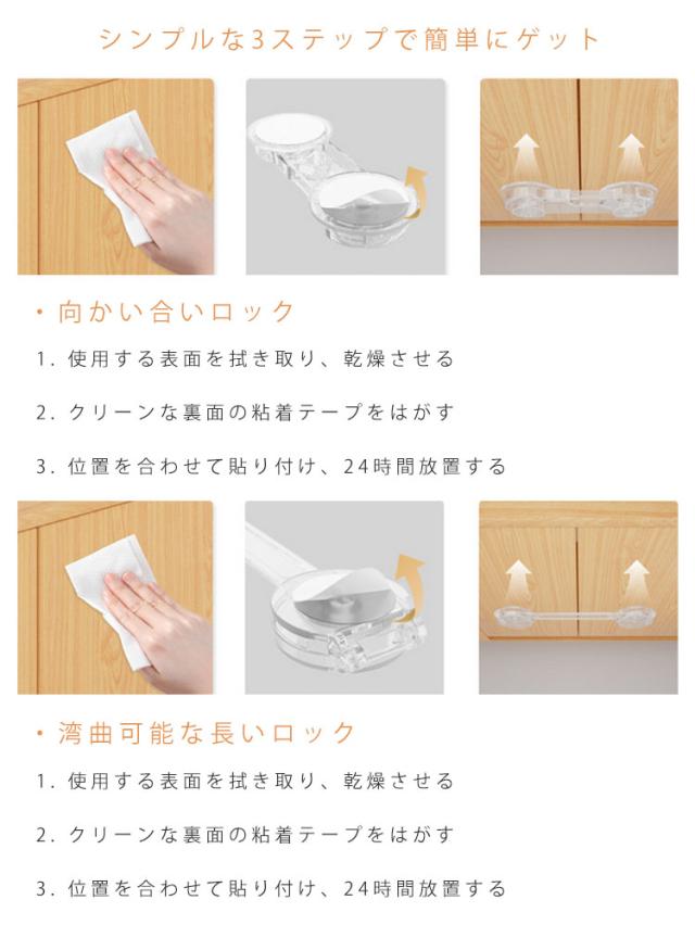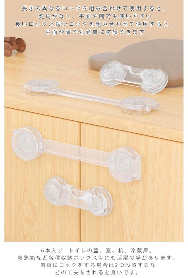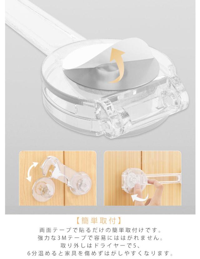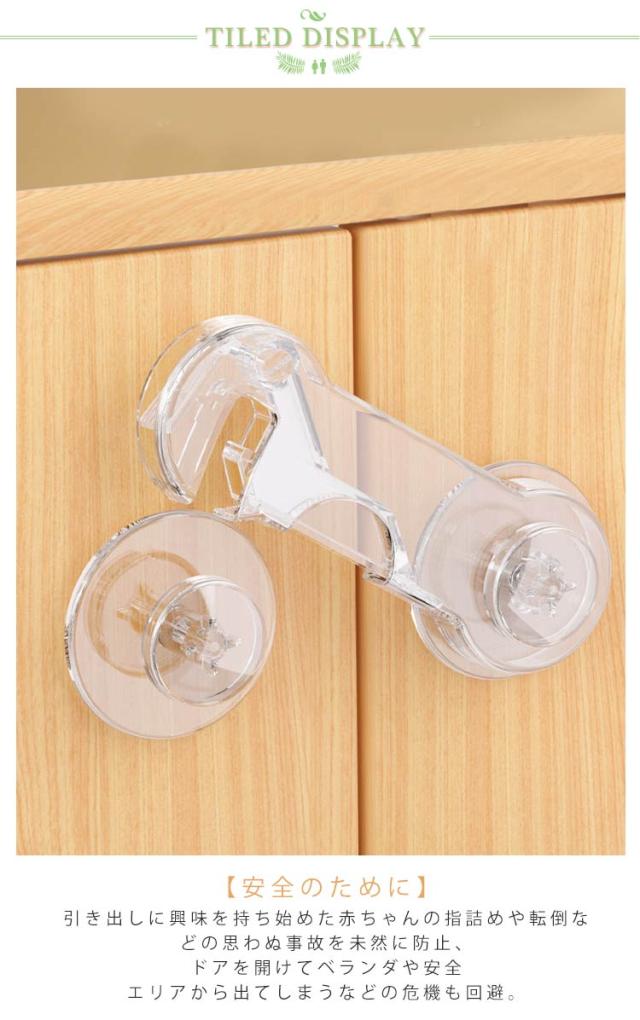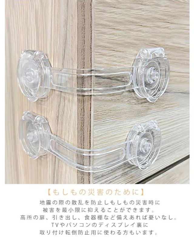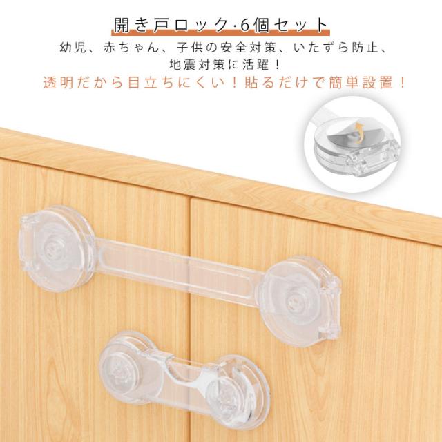 | 幼児、赤ちゃん、子供の安全対策、いたずら防止、地震対策に活躍! 透明だから目立ちにくい! 貼るだけで簡単設置! 開き戸ロック 【6個セット】 【安全のために】 引き出しに興味を持ち始めた赤ちゃんの指詰めや転倒などの思わぬ事故を未然に防止、ドアを開けてベランダや安全エリアから出てしまうなどの危機も回避。 安全、環境にやさしい材質ABS樹脂で作られており、非毒性、耐衝撃性、耐久性が高い赤ちゃん向け商品といえます。 【もしもの災害のために】 地震の際の散乱を防止しもしもの災害時に被害を最小限に抑えることができます。高所の扉、引き出し、食器棚など備えあれば憂いなし。TVやパソコンのディスプレイ裏に取り付け転倒防止用に使わる方もいます。 【シンプルでおしゃれ】 シンプルな構造と清潔感のある透明色なので目立ちにくく、家具のスタイルを損ないません。ご家庭のあらゆる場所でスタイリッシュに設置できます。 【簡単取付】 両面テープで貼るだけの簡単取付けです。 6本入り :トイレの蓋、窓、机、冷蔵庫、救急箱など各種収納ボックス等にも活躍の場があります。厳重にロックをする場合は2つ設置するなどの工夫をされると良いです。 強力な3Mテープで容易にははがれません。取り外しはドライヤーで5、6分温めると家具を傷めずはがしやすくなります。 | |