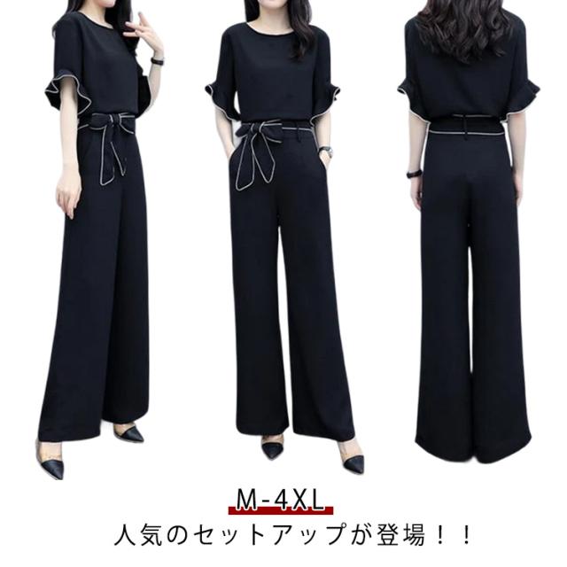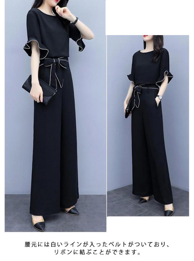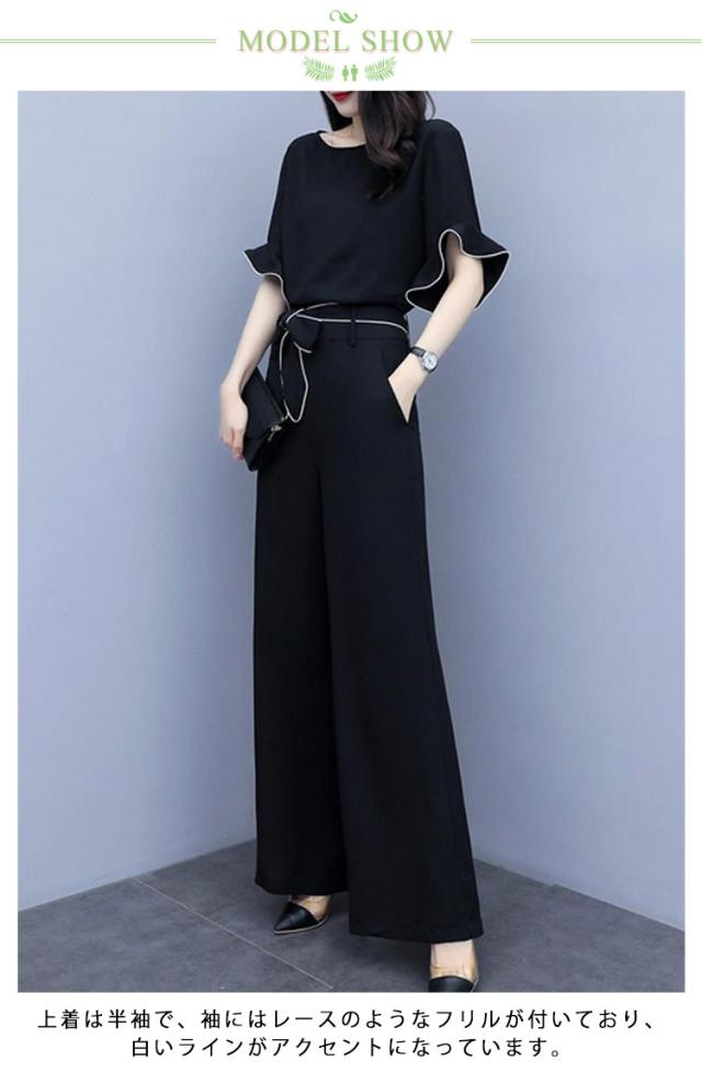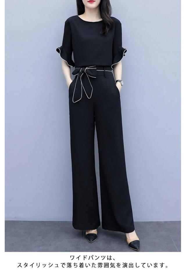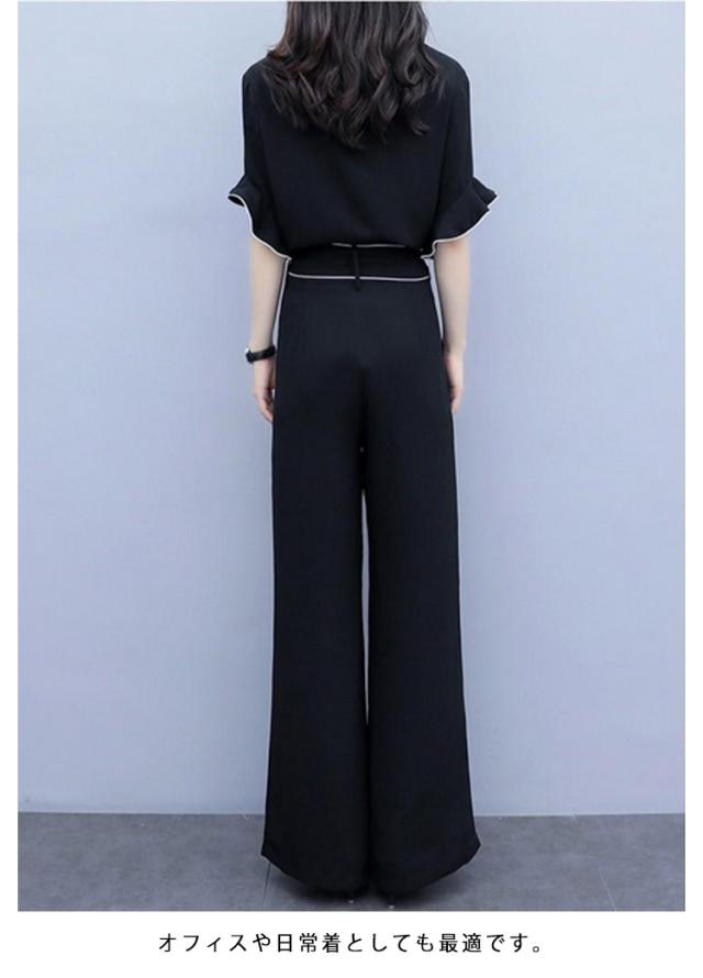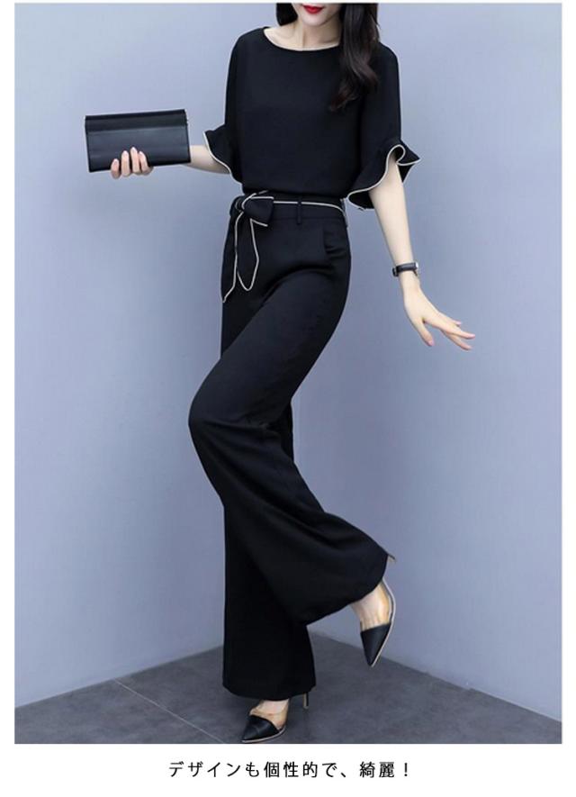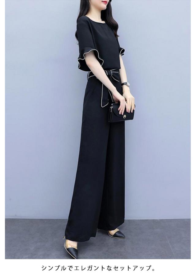 | 人気のセットアップが登場!! デザインも個性的で、綺麗! シンプルでエレガントなセットアップ。 上着は半袖で、袖にはレースのようなフリルが付いており、白いラインがアクセントになっています。 腰元には白いラインが入ったベルトがついており、リボンに結ぶことができます。 ワイドパンツは、スタイリッシュで落ち着いた雰囲気を演出しています。 オフィスや日常着としても最適です。 | |