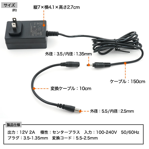 12V 2A汎用スイッチングACアダプター(プラグ 外径 3.5mm 内径 1.35mm / 外径 5.5mm 内径 2.5mm 対応)12V 2A 電気安全法 PSE適合商品 ACアダプタ 3.5-1.35mm 変換ケーブル5.5-2.5mm 送料無料