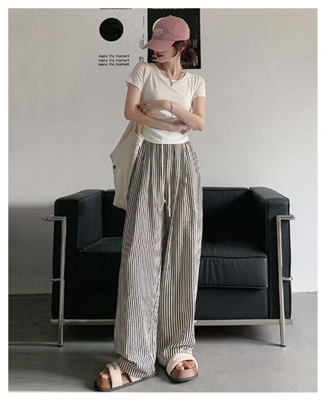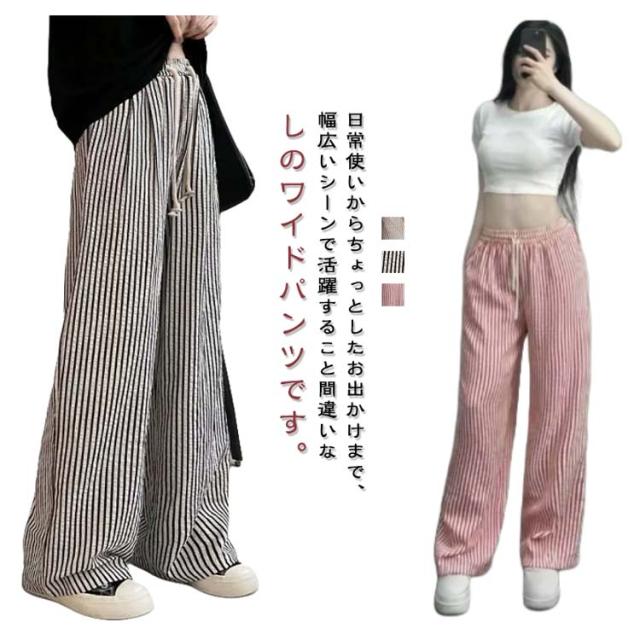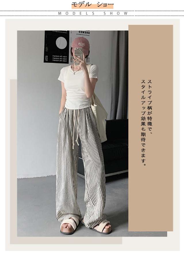 ストライプ パンツ レディース 春 夏 秋 ワイドパンツ ボトムス ひんやり 涼しい パンツ ワイド スラックス ワイドパンツ ストライプ柄 美シルエット ハイウエスト 落ち感 カジュアル シンプル モード ナチュラル
