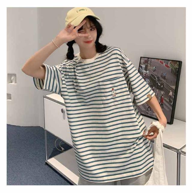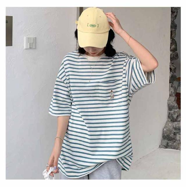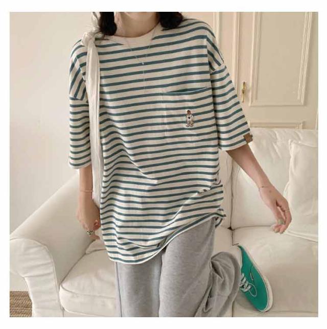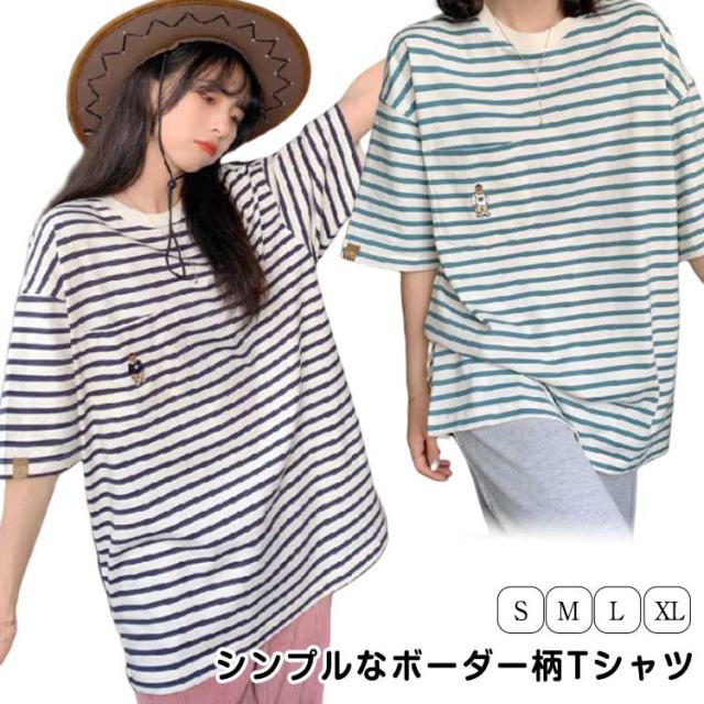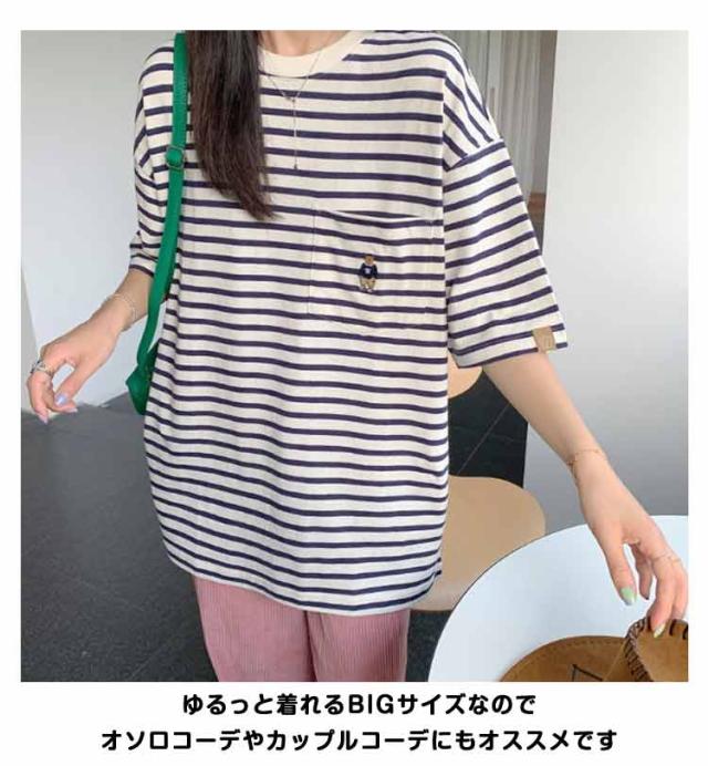 Tシャツ レディース ボーダー 半袖 トップス 半袖 ボーダー柄 熊柄 かわいい ロング丈 ティシャツ 半袖 二の腕カバー 大人かわいい ゆったり カットソー 春夏 夏服