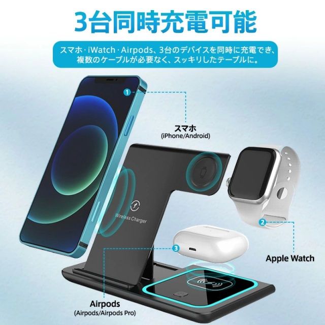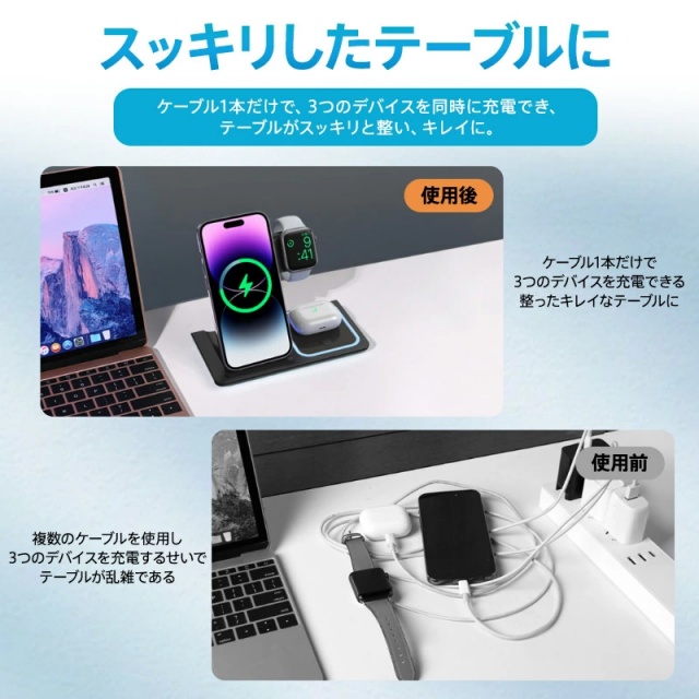 スマホ・iWatch・Airpods、3台のデバイスを同時に充電でき、複数のケーブルが必要なく、すっきりしたテーブルに。