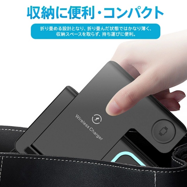 折りたたみ式の設計となり、収納・持ち運びに便利!もちろん、折り畳んだ状態でも充電できる。