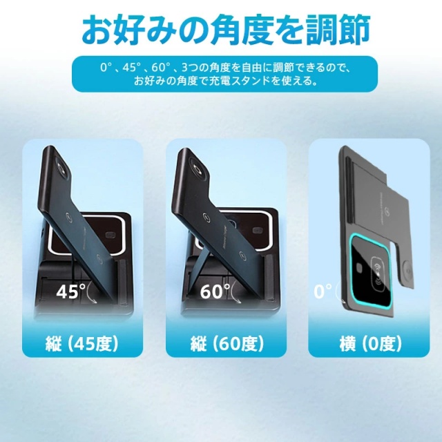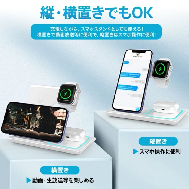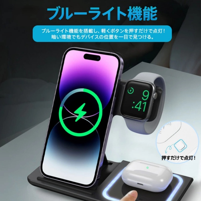 ワイヤレス充電器 3in1 iPhone 16 15 14 スタンド ブルーライト搭載 Airpods Pro Apple Watch Andriod Qi ワイヤレスチャージャー 急速充電 3台対応 アンドロイド ワイヤレス 充電器