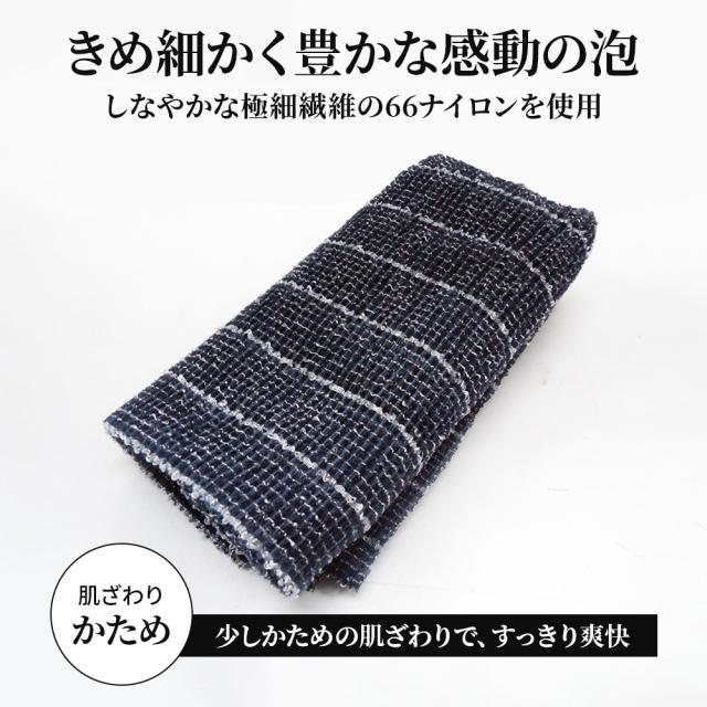 しなやかな極細繊維の66ナイロンを使用した、キメ細やかで豊かな泡立ちのボディタオル。