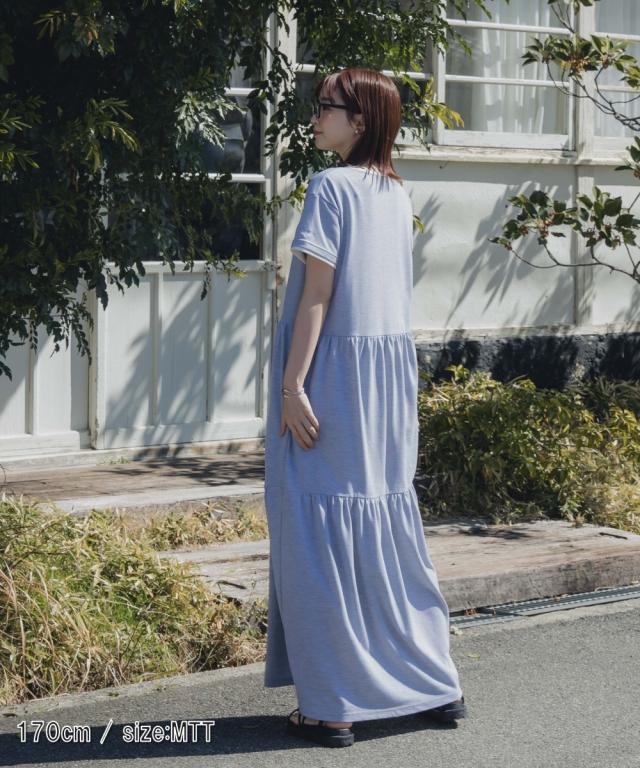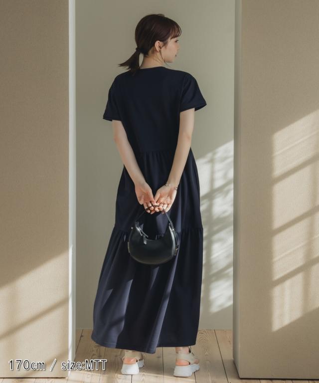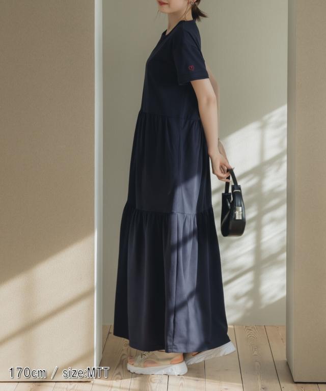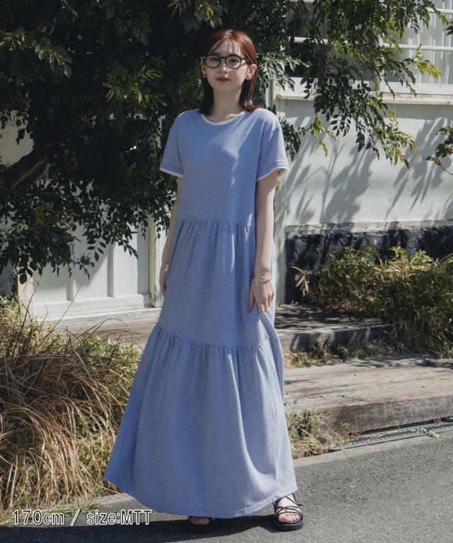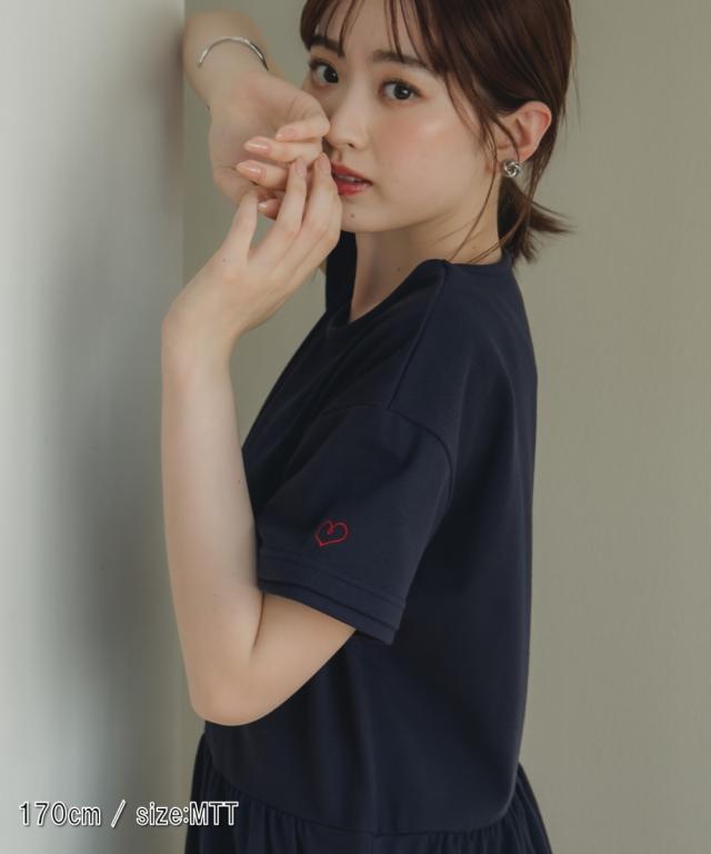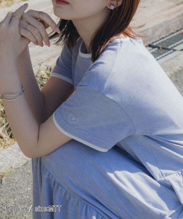【高身長な方向け】夏に着たい鹿の子素材ボリュームフレアマキシ丈ワンピース ■デザイン ・すっきり着れるラウンドネックデザイン。・衿元、袖口周り配色デザイン(杢グレー)。ネイビーは同色となります。・左袖部分ハート柄刺しゅう入り。・ウエスト切り替え、スカート部ティアードデザイン ■素材 ・清涼感と通気性に優れたさらっとした肌あたりの鹿の子素材を使用。 ■おすすめのスタイリング 1枚で着れる夏ワンピ。スニーカー、サンダルどちらでも相性ばっちりです 細部まで可愛いを詰め込んだこだわりのアイテムです。