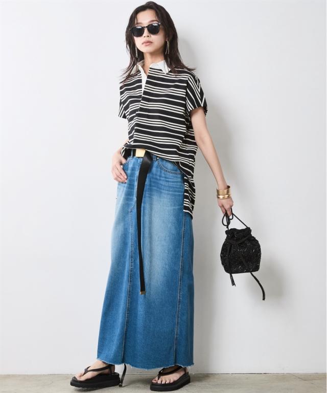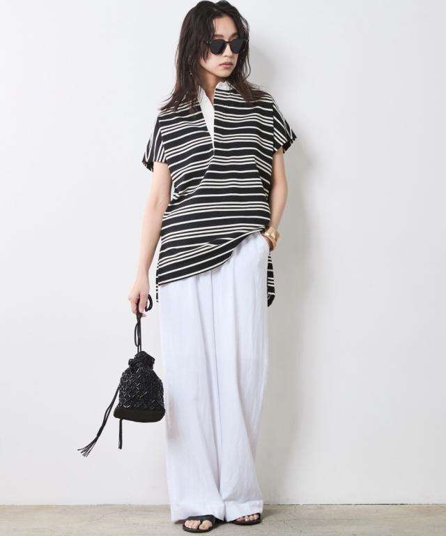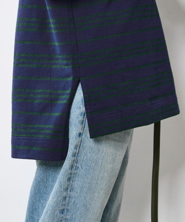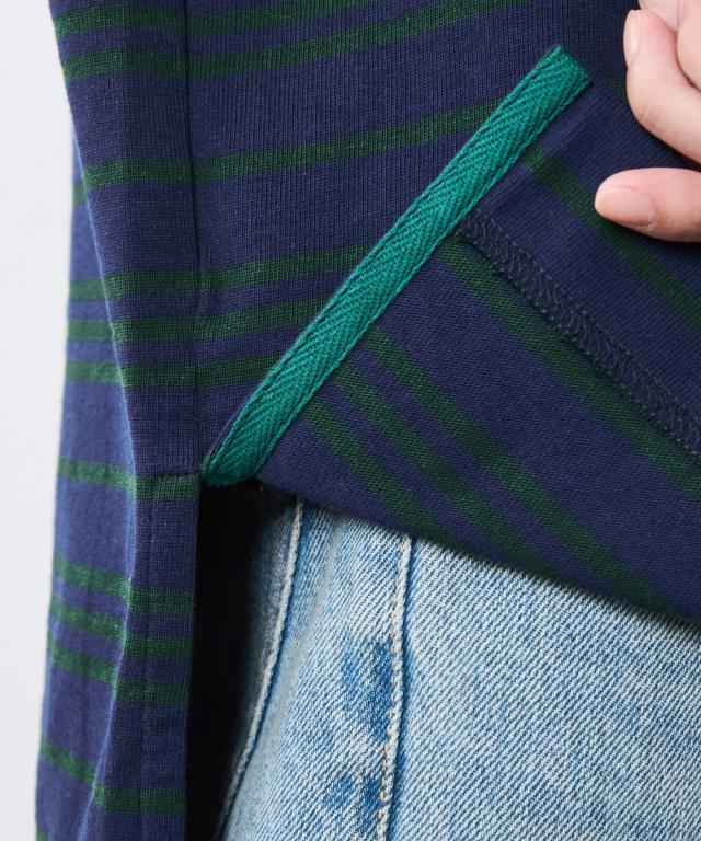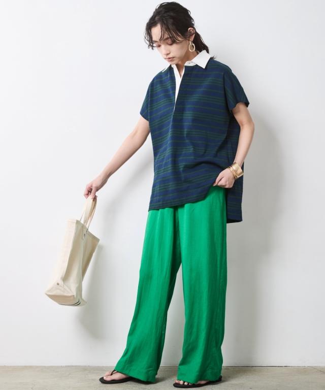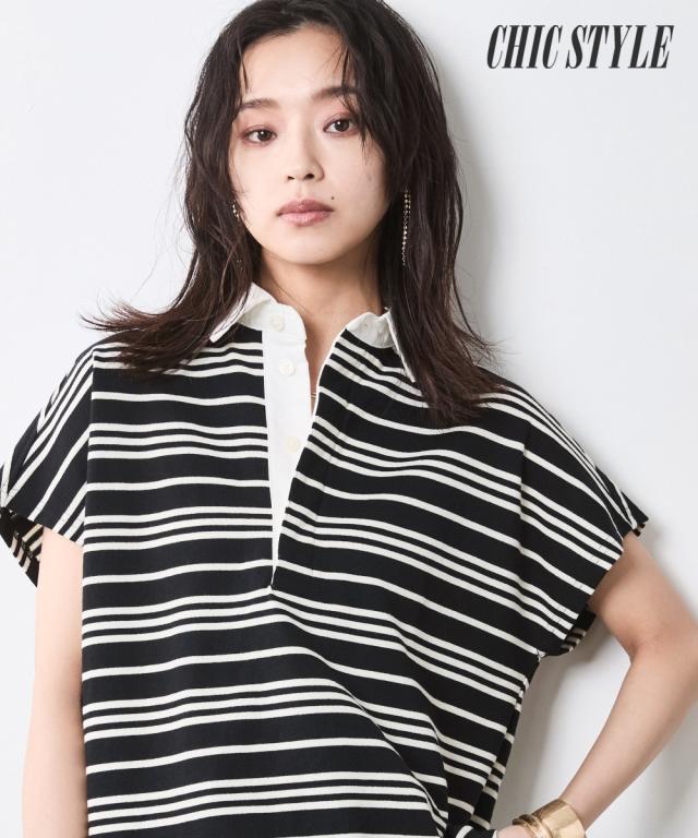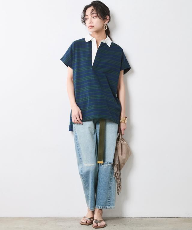 ボーダー柄が目を惹く、ゆったりシルエットのラガーシャツ。 ■デザイン 大人のカジュアルスタイルにスポーツテイストをほどよくMIXし遊び心をプラスしたラガーシャツ。 緩やかな曲線を描くフレンチスリーブデザインだからカジュアル過ぎず女性らしいシルエットになるのも魅力のひとつ。 オトナカジュアルのリラックス感のある着こなしを楽しんで。 ■素材 程よく厚みのある天竺生地を使用。 ■おすすめのスタイリング インしてもアウトにしても決まる前後差のあるデザインなのでスカートでもパンツとも合わせやすいです。