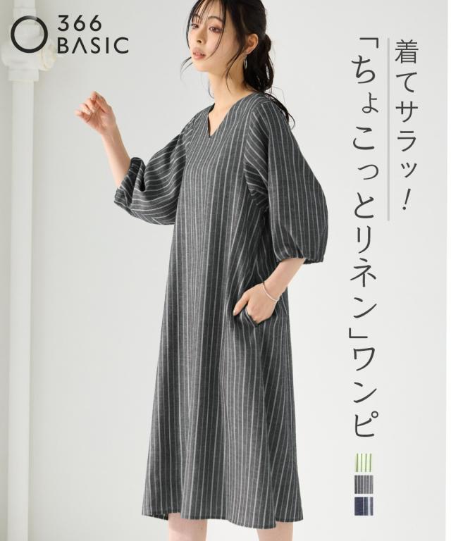 ちょこっとリネンが良きところな夏素材ワンピース ■デザイン バルーン袖で即こなれる。1枚着るだけですぐにおしゃれだから忙しい朝に嬉しいアイテム。Vネックで顔回りもすっきり見えます。程よくインパクトのあるストライプ柄が夏の太陽に映え、リゾートにも最適! ■素材 リネン素材は夏に最適だけど、デメリットも多い・・そこでリネンの良さを損なわずデメリットを払拭した「ちょこっとリネン」。暑い夏をカイテキに過ごす機能素材です。 ■おすすめのスタイリング 1枚着るだけでサマになる。ボトムとレイヤードしてもオシャレです。