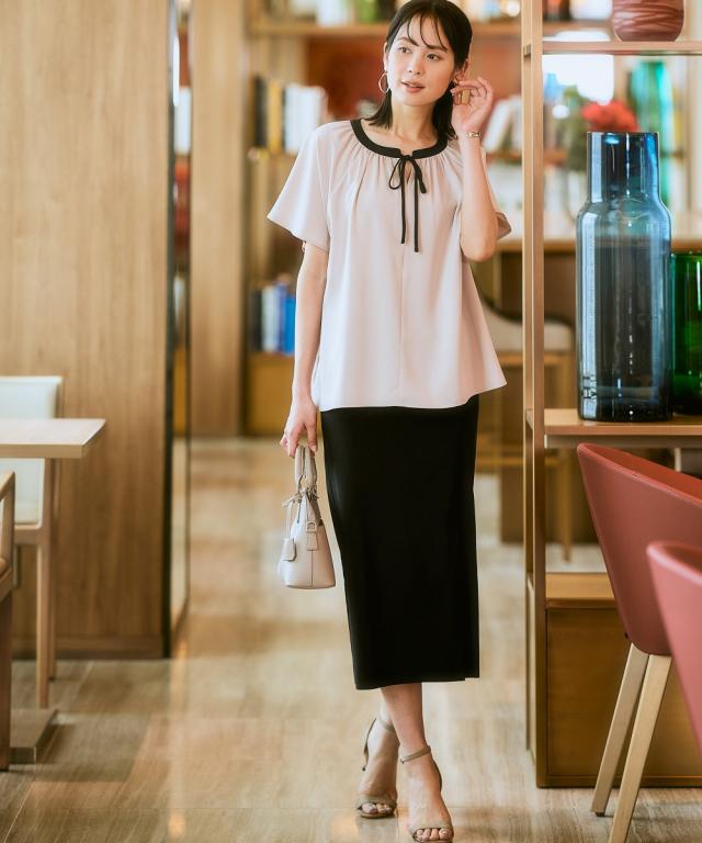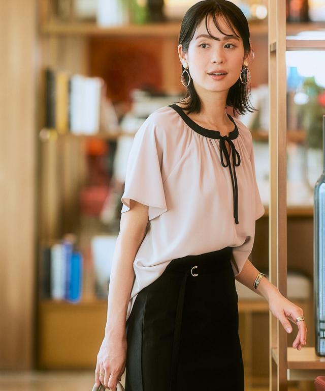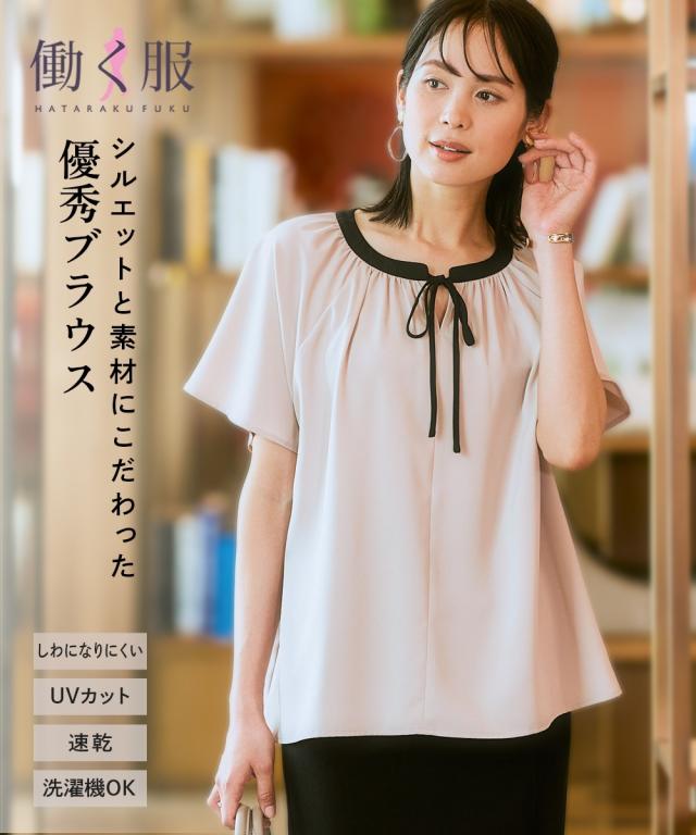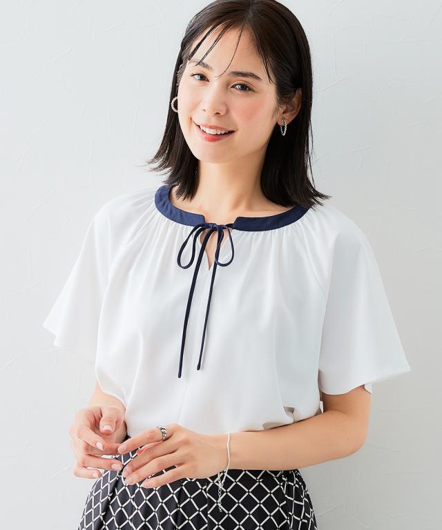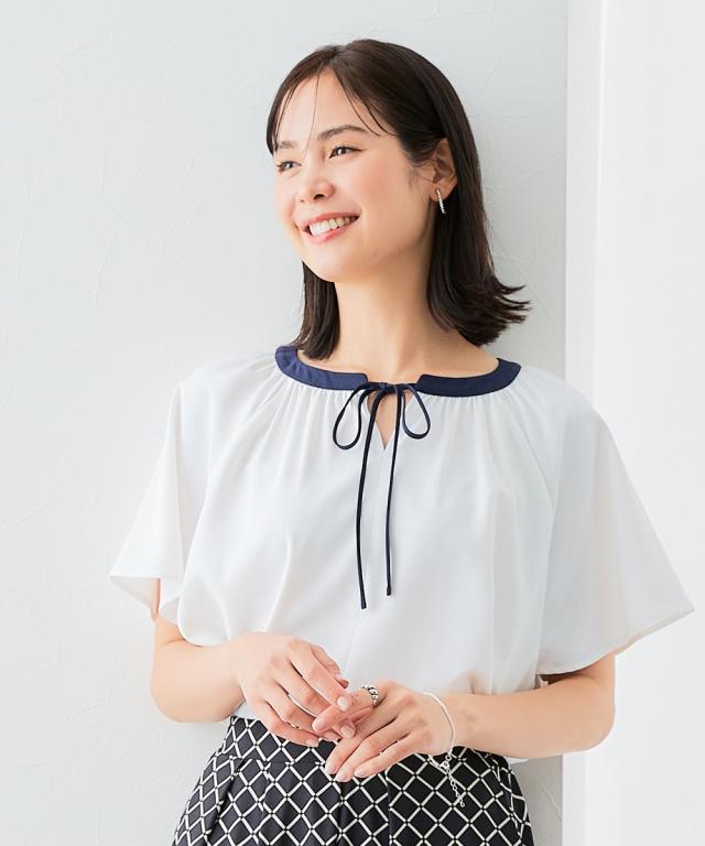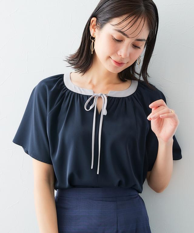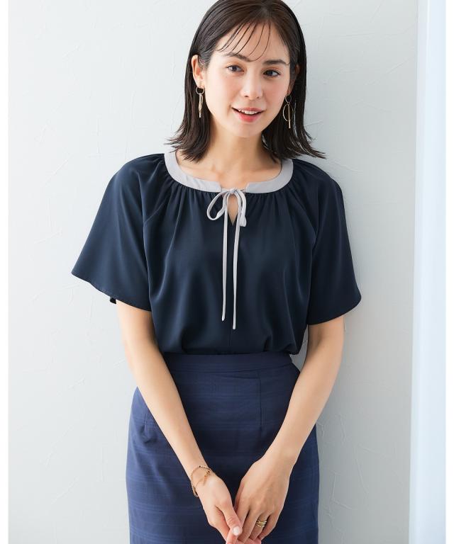 ストレッチパウダーサテン配色リボン半袖ブラウス(しわになりにくい・速乾・洗濯機OK・UVカット)