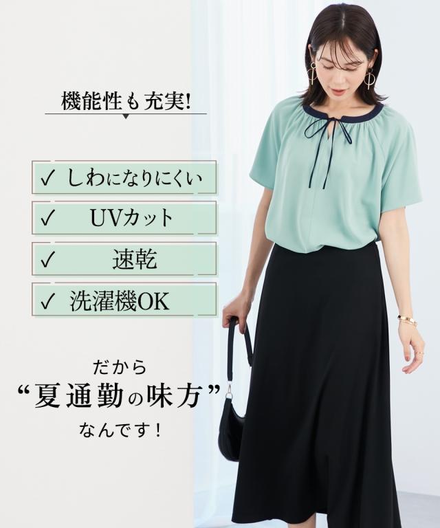 シャツ ブラウス レディース ストレッチ パウダーサテン配色リボン 半袖 しわになりにくい 速乾 洗濯機OK UVカット 有 夏 S/M ニッセン nissen