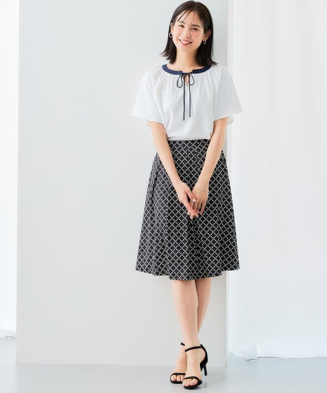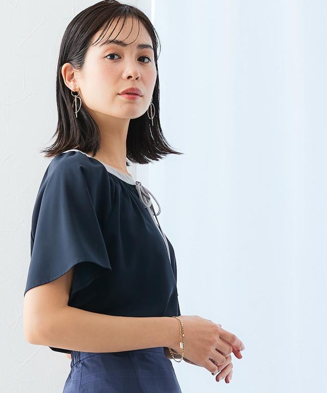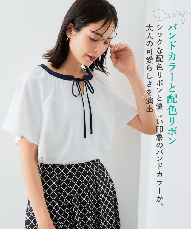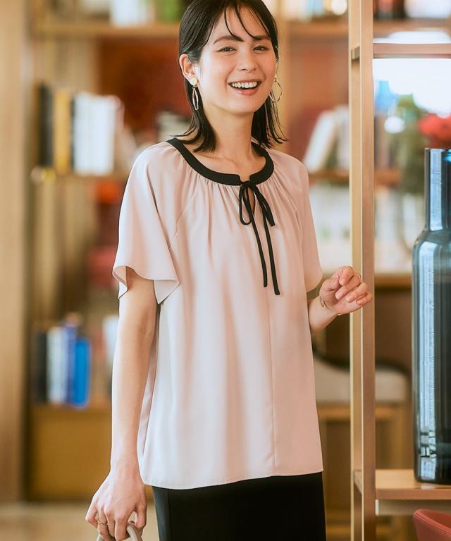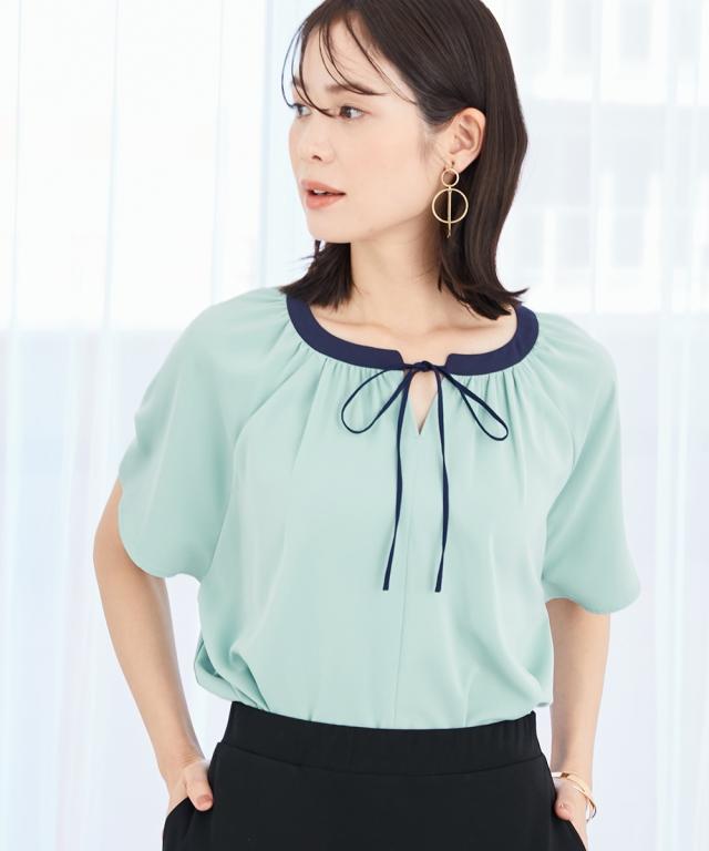 ストレッチパウダーサテン配色リボン半袖ブラウス(しわになりにくい・速乾・洗濯機OK・UVカット)
