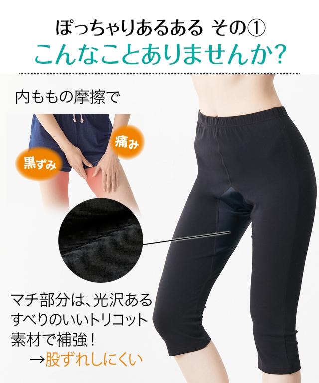 綿混ぽっちゃりさんのための7分丈レギンス 。こんな方におすすめ・太ももの股ずれにお悩みの方 ・摩擦で内側がすぐ破れてしまう方 ・いつものレギンスではぴったりフィットしない方 ・大きいサイズのオーバーパンツをお探しの方 こんなことありませんか 「内ももの摩擦で【黒ずみ】や【痛み】…」 マチ部分は、光沢のあるすべりのいいトリコット素材で補強!→股ずれしにくい 「普通のオーバーパンツはお尻にくいこむ…」 ワイドサイズのマチ付にすることでヒップに自然にフィット◇◆POINT◆◇ ・身生地は綿95%でやさしい肌ざわり ・裏側は縫いしろ部分が痛くならないよう凹凸のすくないフラットシーマ縫製 『きっと見つかる自分サイズ』 自信をもってお届けできる商品だからたくさんの人に着てほしい! LLから10Lサイズまで豊富な7サイズ展開
