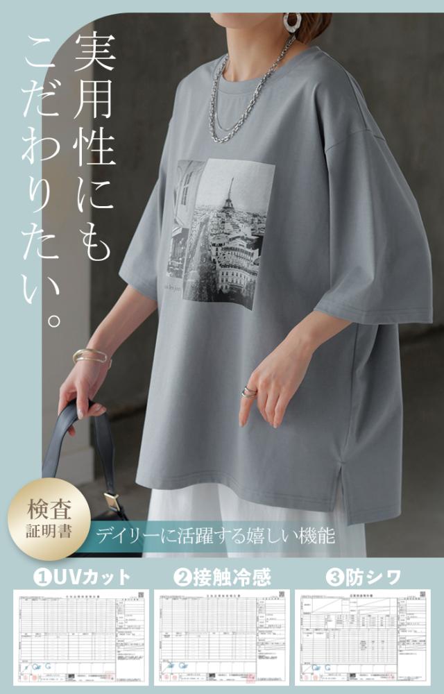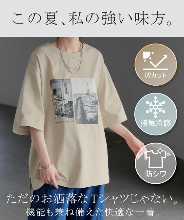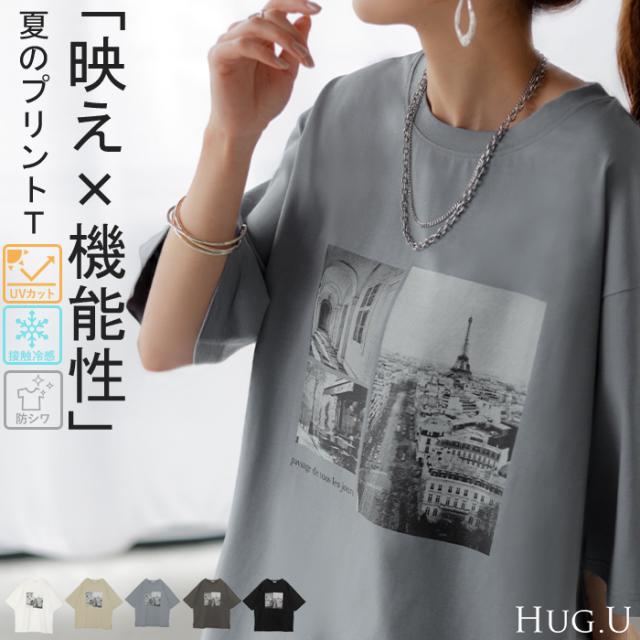Tシャツ ロゴ 接触冷感 UVカット トップス レディース 半袖 プリント カットソー ロング ティーシャツ フォトT チュニック ビッグ 長い ドルマン ゆったり 無地 体型カバー お尻が隠れる 大きいサイズ 白 黒 春 夏 HUG.U メール便