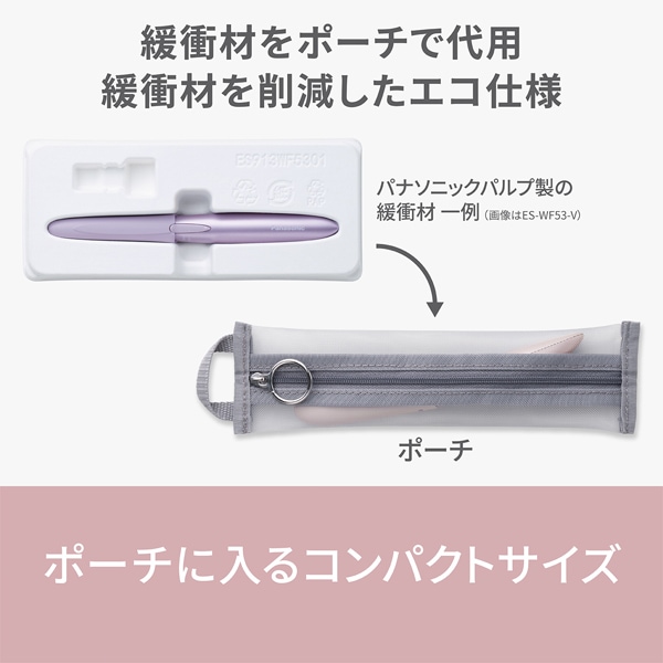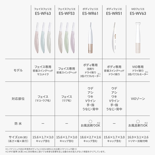 フェイスフェリエ ES-WF63 肌にやさしくささっと剃れる。マユケアまでできるプレミアムモデル。 ・丸い刃先で肌にやさしい、約0.12mmのうす刃。水なしですっきり剃れる。 ・肌の凸凹に合わせて動く、密着スイングヘッド。 ・マユのお手入れができる。マユカバーとマユコーム付き。 ■カラー:ブルー ■電源方式:乾電池式 ■電源・電圧:DC1.5V(単4形アルカリ乾電池または単4形充電式電池×1本) ■電池寿命:週2回(1回約5分間)の使用で約1カ月間使用可能(室温20℃の時)※ ■用途 ●ウブ毛用 ●マユメイク ■機能 ●密着スイングヘッド ●マユカバー ●マユコーム ※水洗いできません ■本体寸法:高さ15.6×幅1.7×奥行3.0cm(キャップ装着時) ■本体質量:約20g(乾電池除く、キャップ含む) ■生産国:中国 ■付属品:掃除用ブラシ,マユカバー,マユコーム ※パナソニック製アルカリ乾電池を使用した場合 ※記載は商品仕様の一部です。仕様説明不足等の理由での返品はできません。特に適合等は必ずご確認ください。