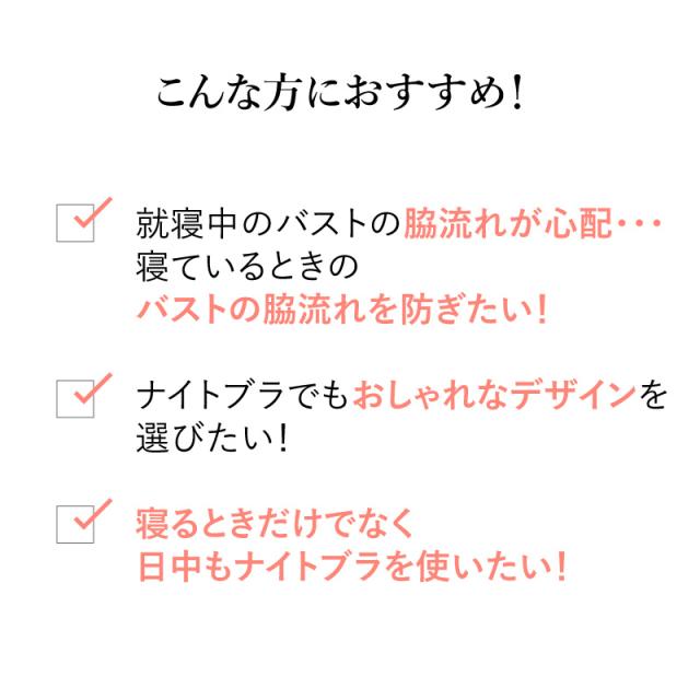 | 特徴 | 「ナイトアップブラルーム」 就寝中も、日中のくつろぎタイムも バストの脇流れをやさしくサポート ●バストの脇流れを防ぐ 就寝中や、くつろぎ時のバストの脇流れを防ぐ、独自の構造 ●軽いつけごこち よく伸びてしめつけない編み立て成型で、フィット性がよい ●肌あたりもやさしく アンダーはテープレスで、しめつけ感が少なく快適 ●立体的なバストシルエット バストトップをカバーしてやさしくととのえる、一体型のウレタン成型パッド付き やさしいつけごこちで睡眠中のバストの脇流れを防ぐ夜用のブラを、日中のくつろぎタイムにも楽しみたい方へ。 カップ脇部分の編み立てを切り替えることで、就寝中はもちろん、ゆったりおうちでくつろぐバストを脇流れからやさしくサポート。 よく伸びる編み立て成型のアンダーテープレス仕様なので、肌あたりもやさしく軽いつけごこち。 取りはずし可能な一体型のウレタンパッドを挿入しているのでバストトップがひびきにくく、日中のリラックスタイムも立体的なバストシルエットにととのえます。 ・パッド受けあり/パッドあり(取りはずし可) |