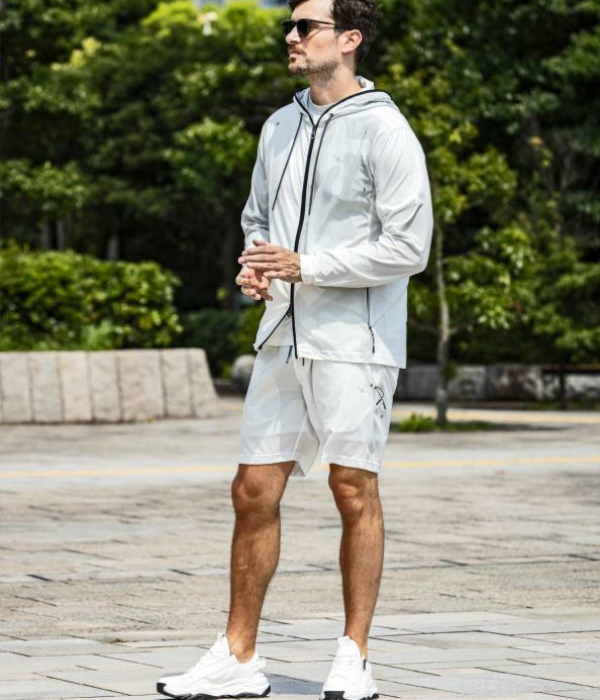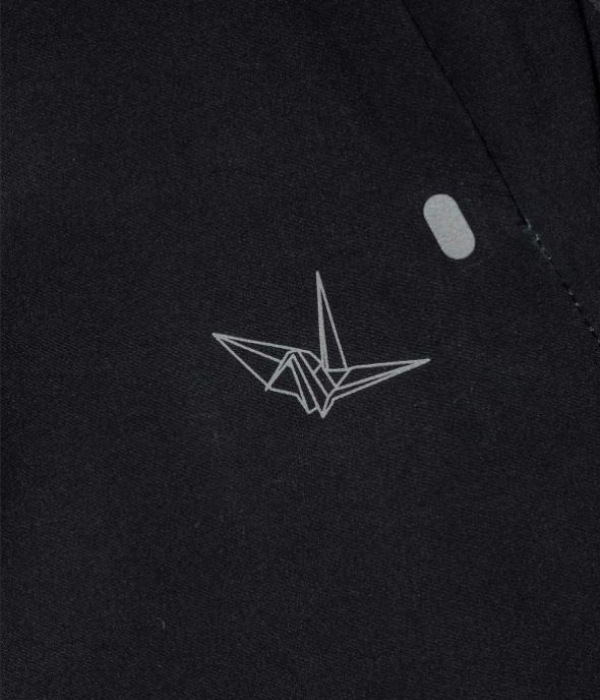 フロントとバックにリフレクタープリントを施し夜間の安全性も確保。腿にブランドアイコン「折り鶴」や、ドローコードにも反射性能を備えています。